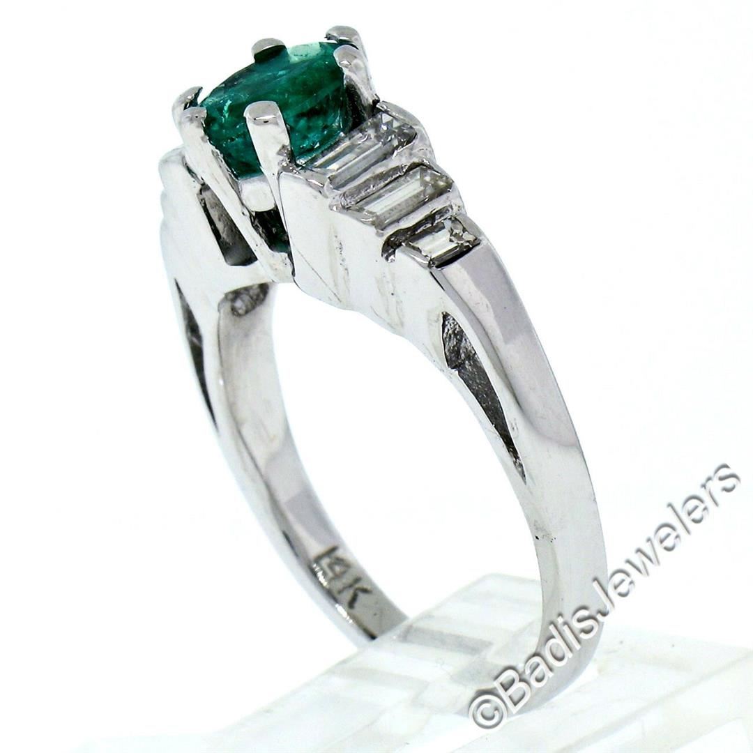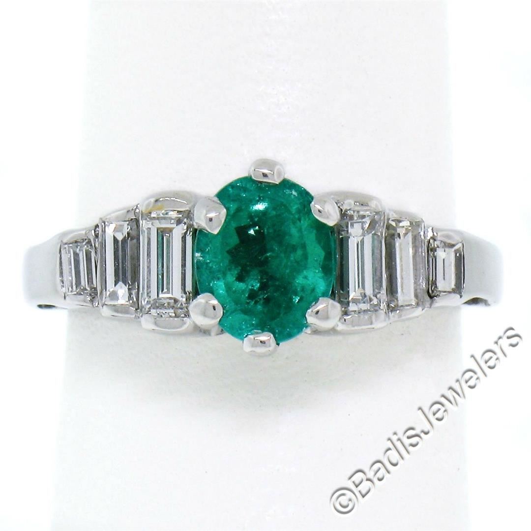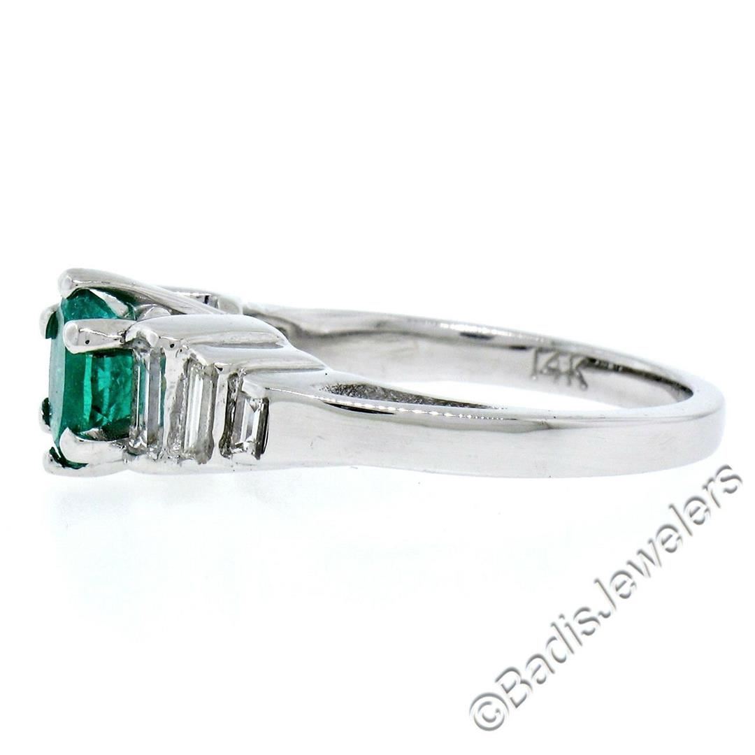 A 14kt white gold step ring with a 0.73ct oval emerald accented by 0.60ctw of baguette cut diamonds (F/G - VVS2/VS1). The ring is size 6.0, weighs a total of 4.95 grams, and measures 7.75mm wide.