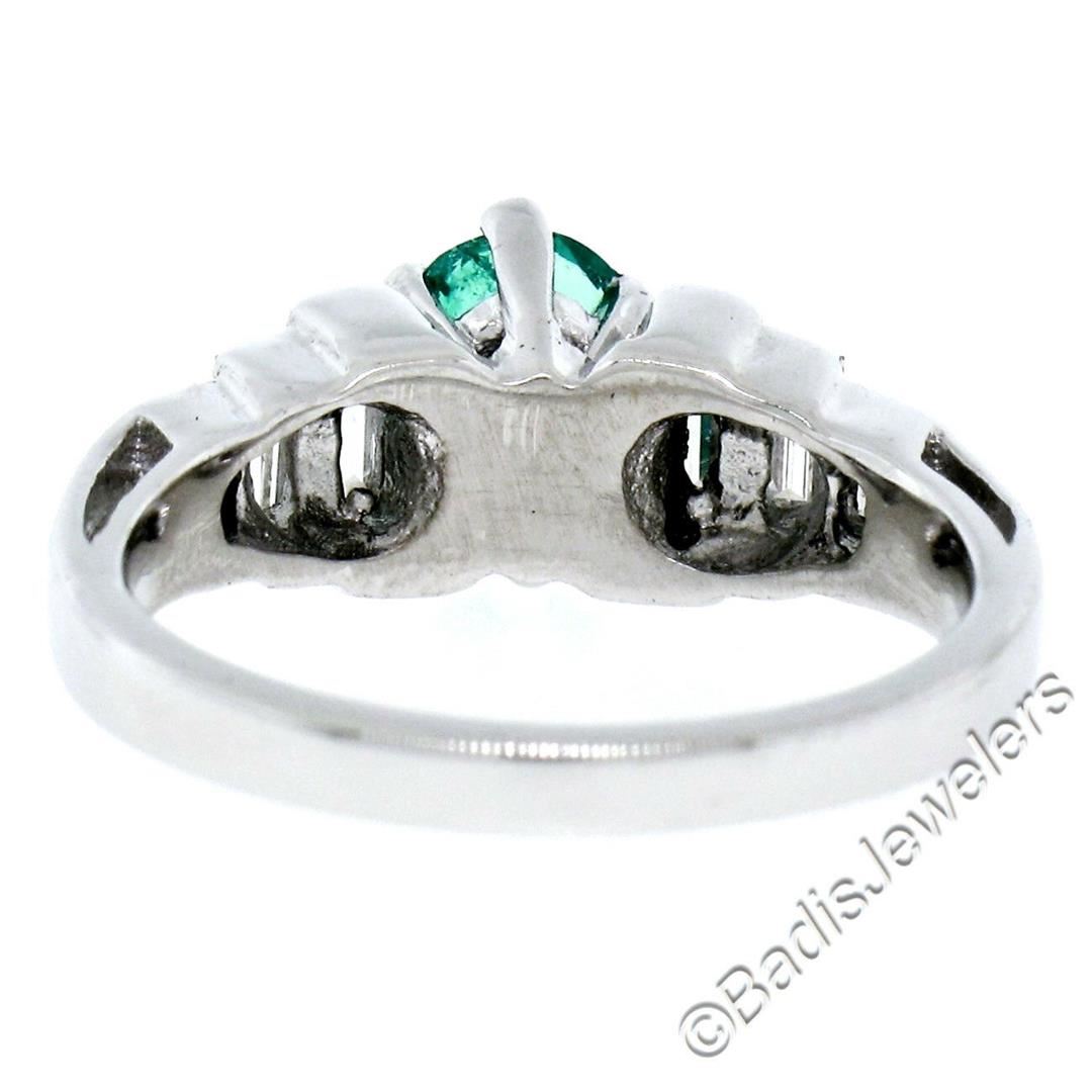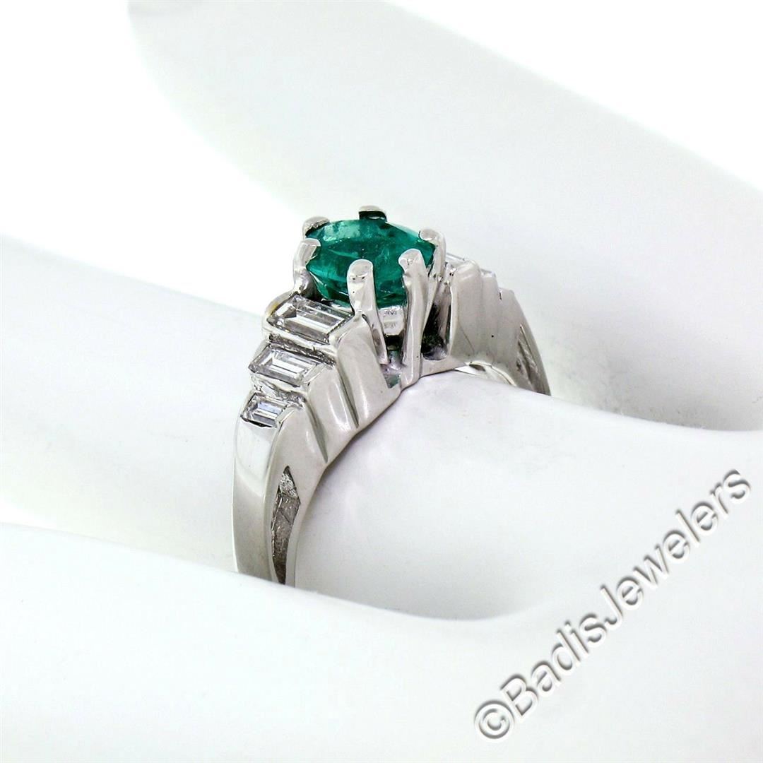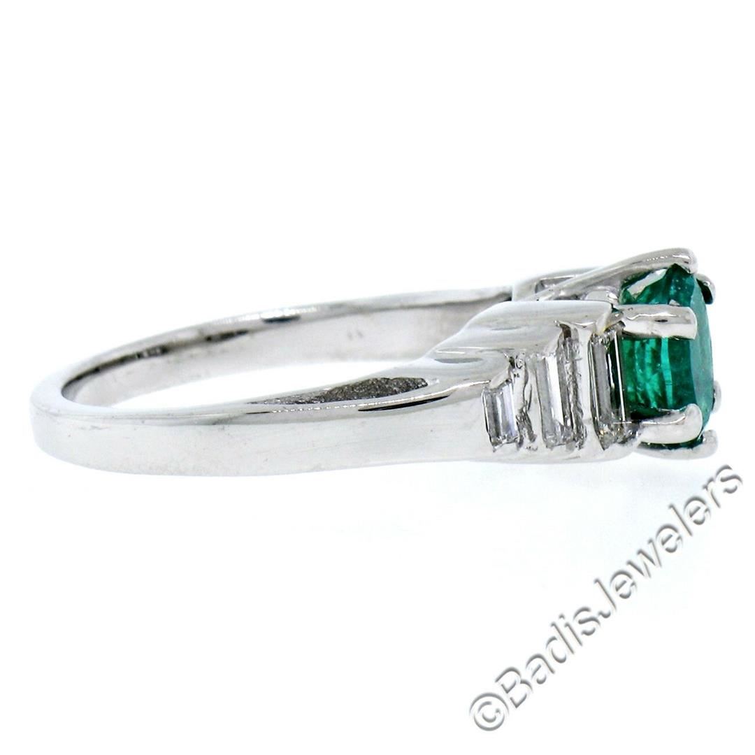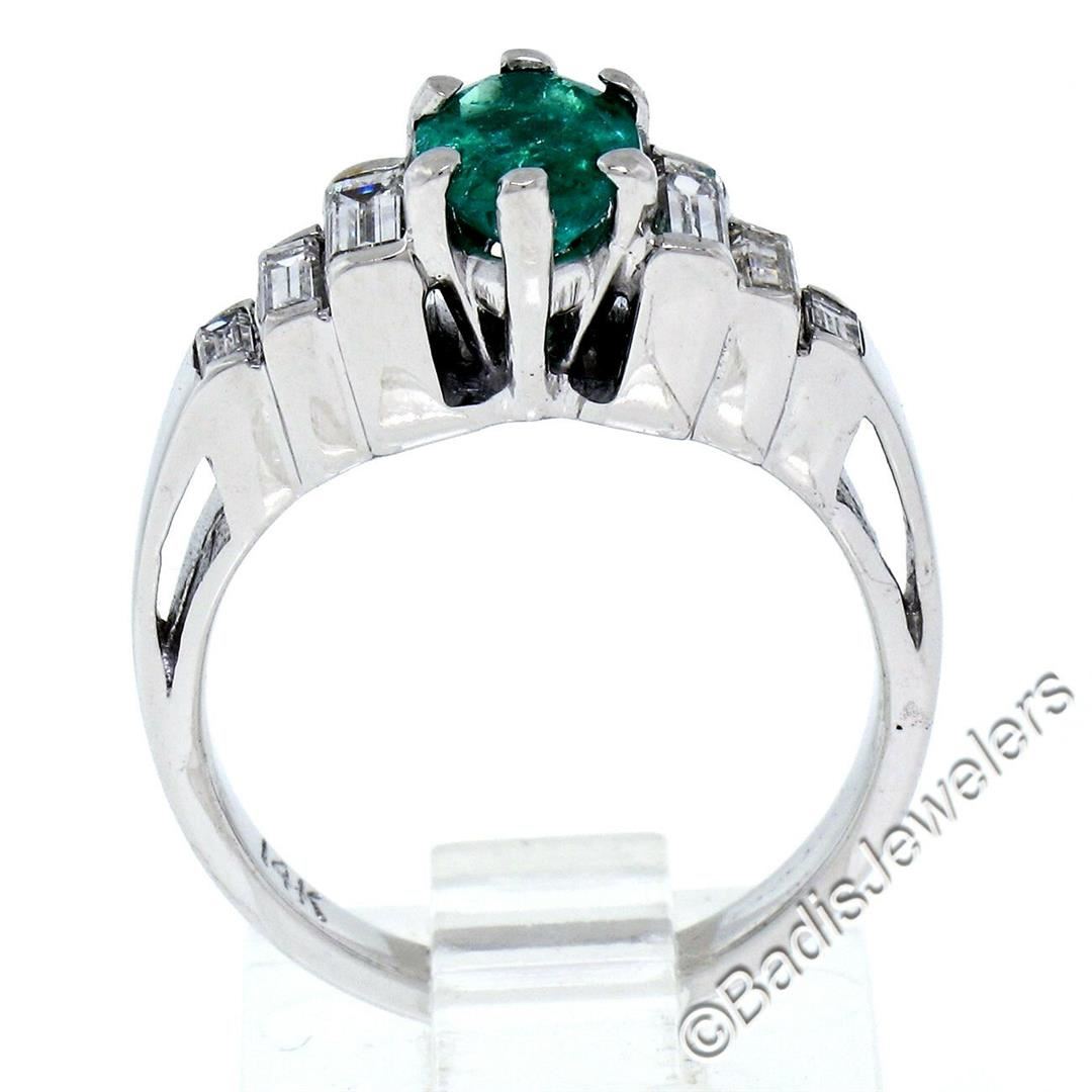 A 14kt white gold step ring with a 0.73ct oval emerald accented by 0.60ctw of baguette cut diamonds (F/G - VVS2/VS1). The ring is size 6.0, weighs a total of 4.95 grams, and measures 7.75mm wide.