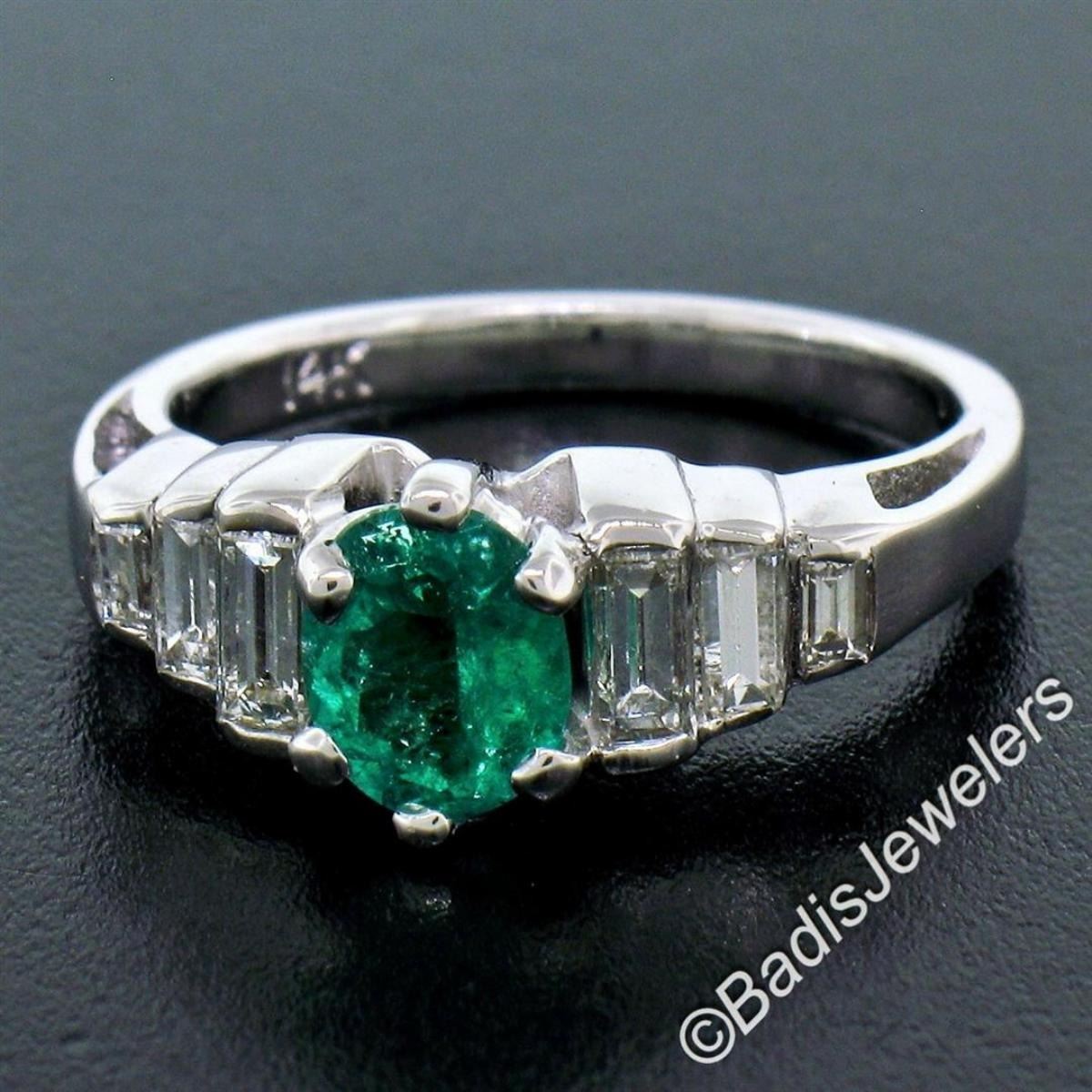 A 14kt white gold step ring with a 0.73ct oval emerald accented by 0.60 ctw of baguette cut diamonds (F/G - VVS2/VS1). The ring is size 6.0, weighs a total of 4.95 grams, and measures 7.75mm wide.