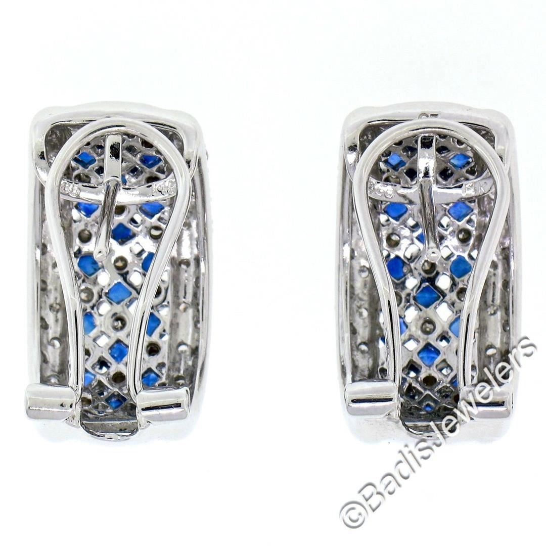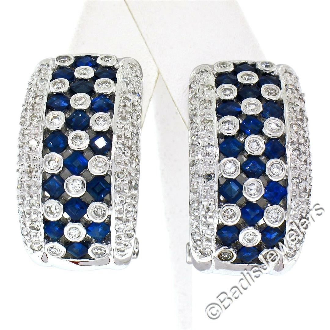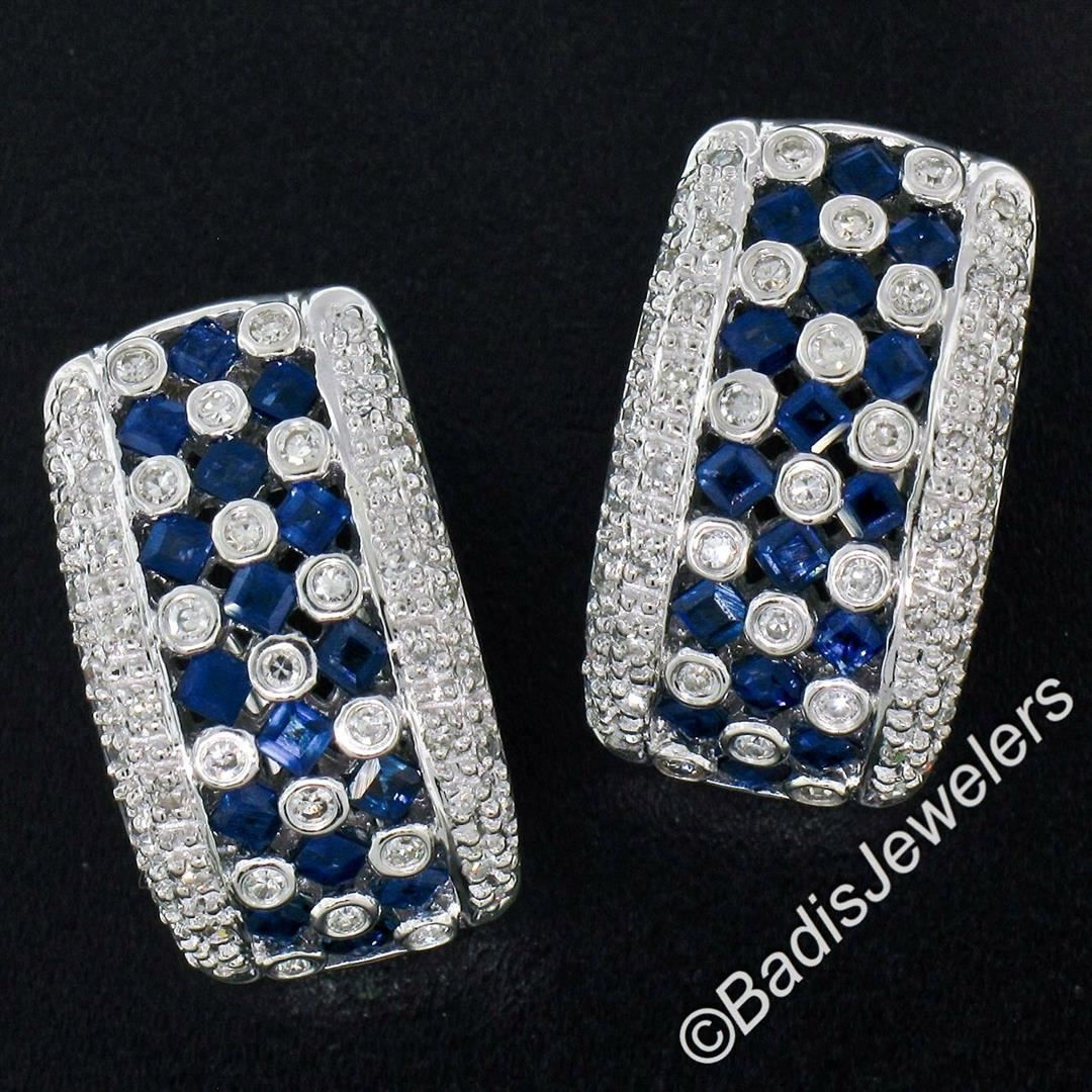 A pair of 14kt white gold checkerboard cuff earrings with 2.00ctw of square sapphires and 0.32ctw round diamonds (H/I - SI1/SI2). The earrings measure approximately 20.00x11.85mm and weigh a total of 9.5 grams.