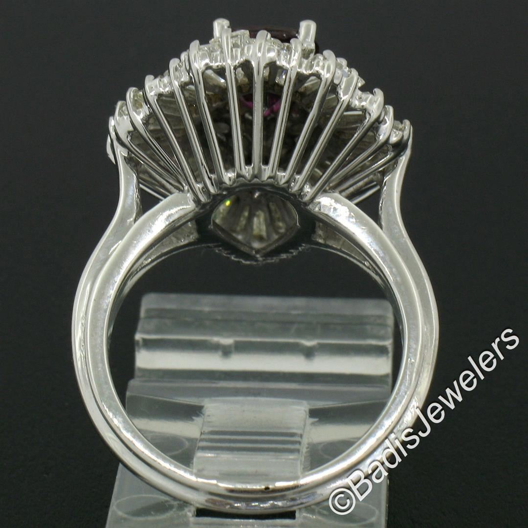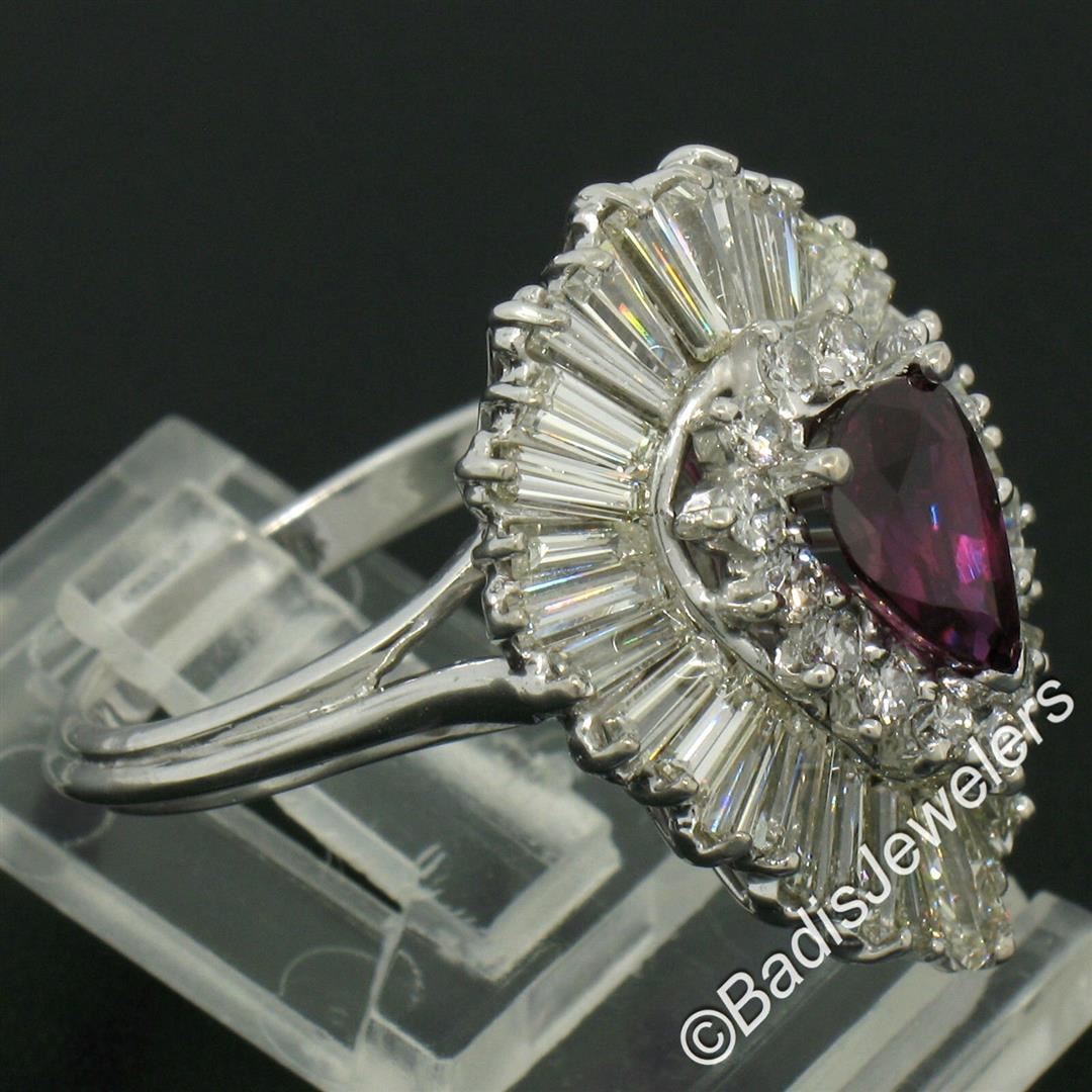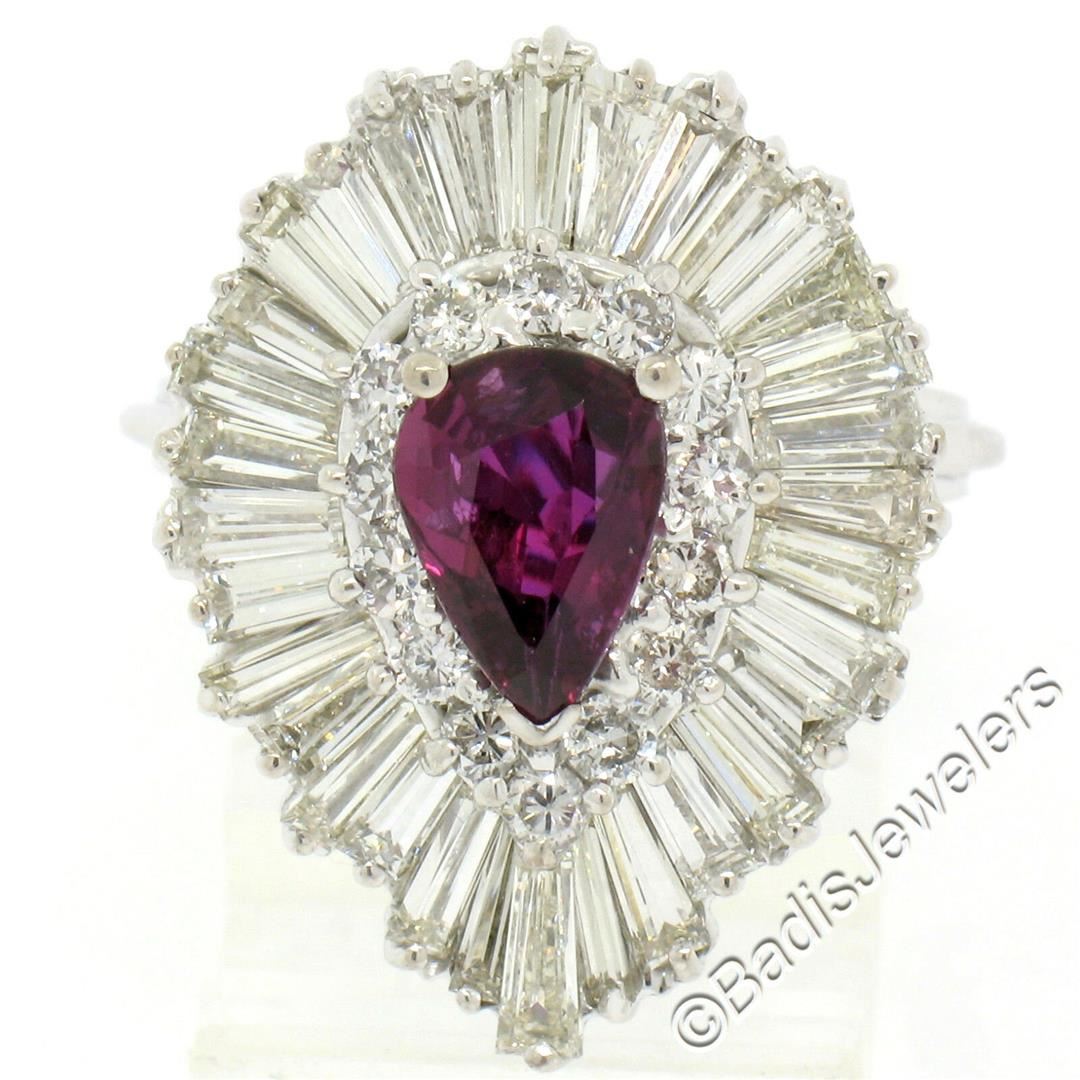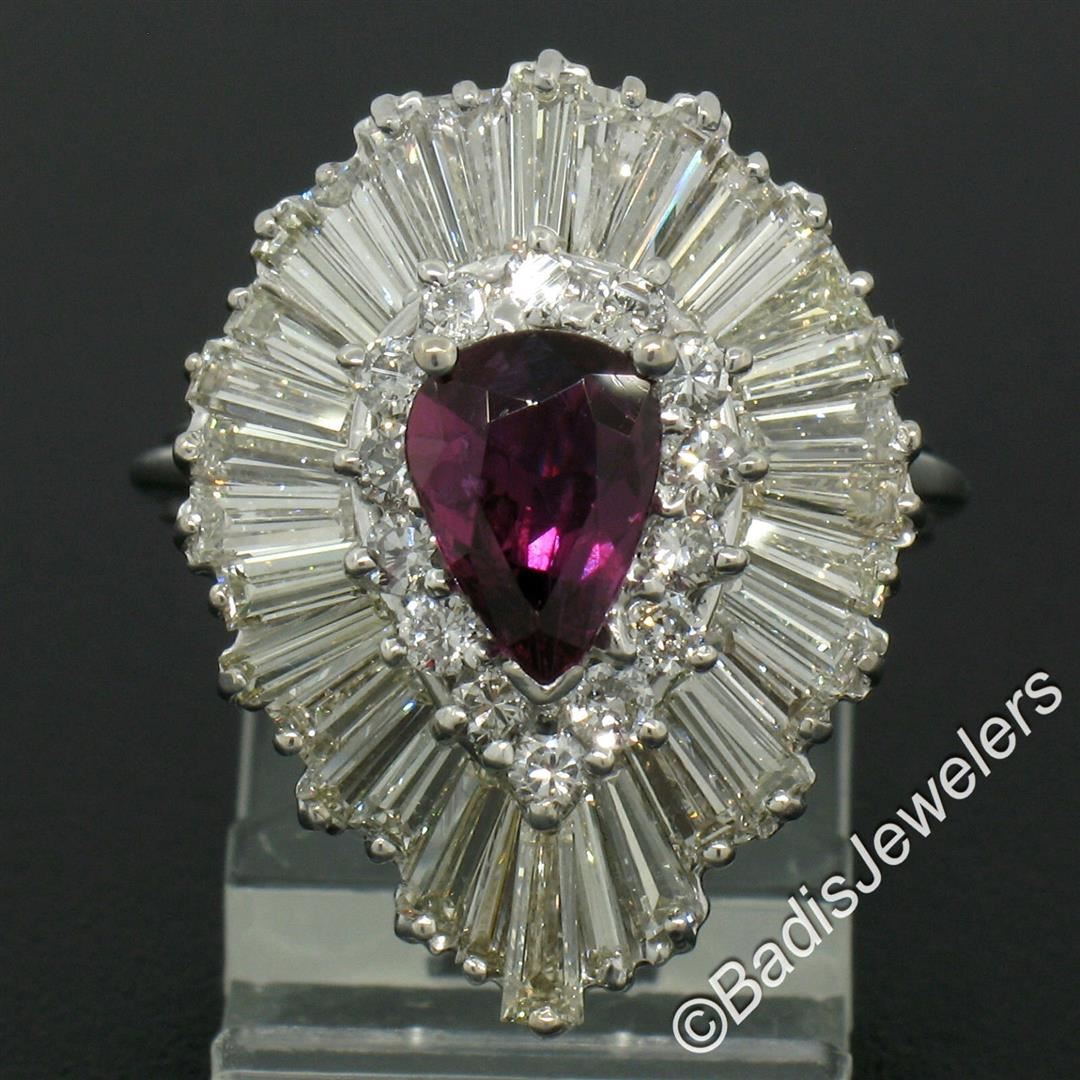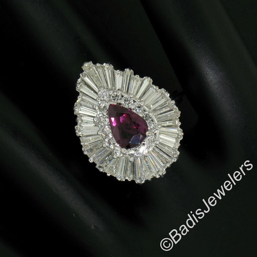 An excellent condition vintage 14kt white gold ring with a 1.35ct pear cut ruby surrounded by 4.05ctw of round and baguette cut diamonds (F to I - VVS1 to VS1). The ring is size 6.5, weighs a total of 7.83 grams, and the top measures approximately 24.15mm long.