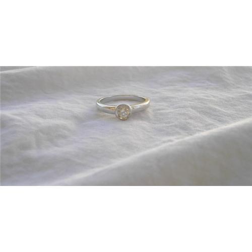 This is a solid 14kt white gold bezel set diamond ring. This is a sizable 6.5. The diamond is aprox .50ct in size.
