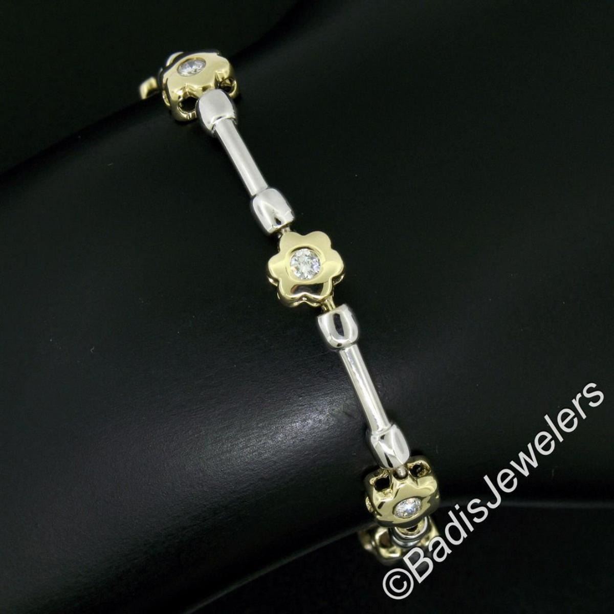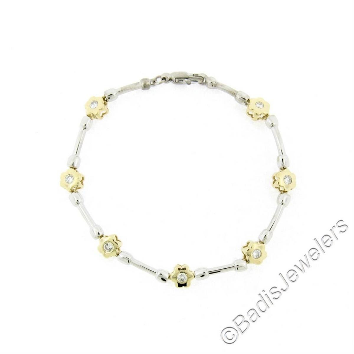 A like new 14kt gold bracelet with 0.50ctw of round diamonds (G/H - VS1/VS2) burnish set into yellow gold flower links which are connected with white gold barbell links. It weighs a total of 10.65 grams, measures 6.45mm wide, and measures 7.5 inches in le