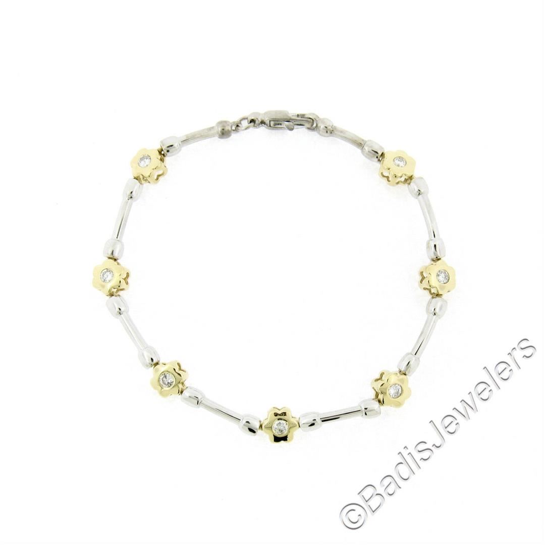 A like new 14kt gold bracelet with 0.50ctw of round diamonds (G/H - VS1/VS2) burnish set into yellow gold flower links which are connected with white gold barbell links. It weighs a total of 10.65 grams, measures 6.45mm wide, and measures 7.5 inches in length.