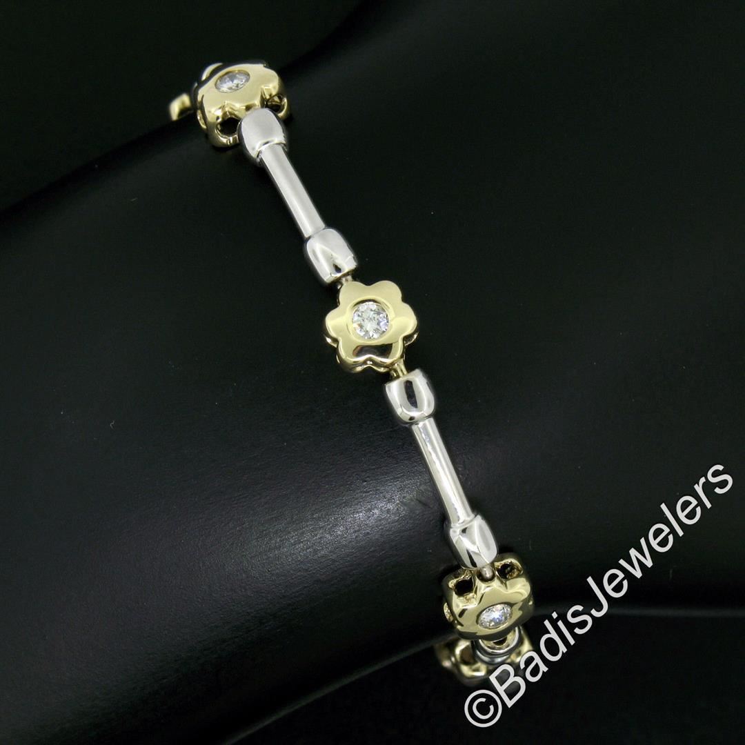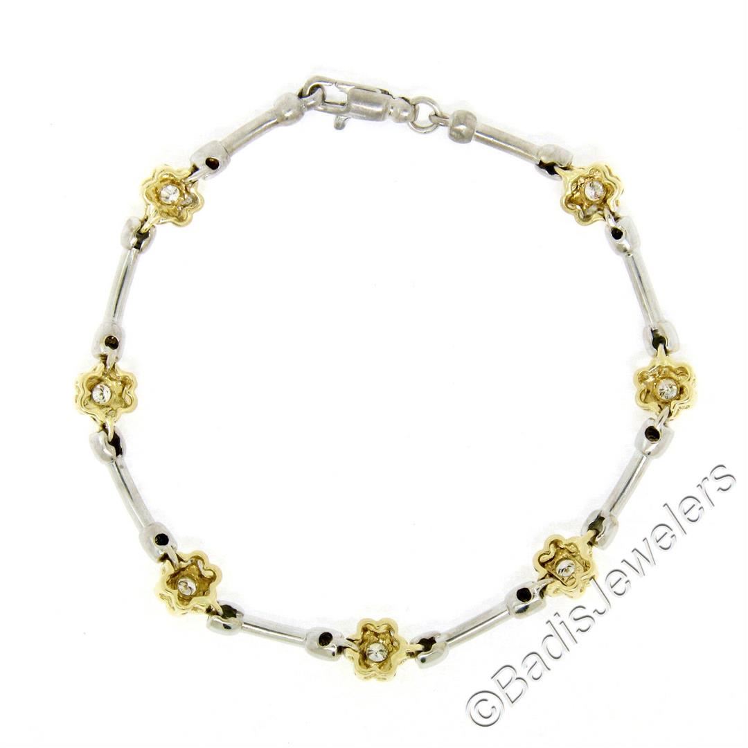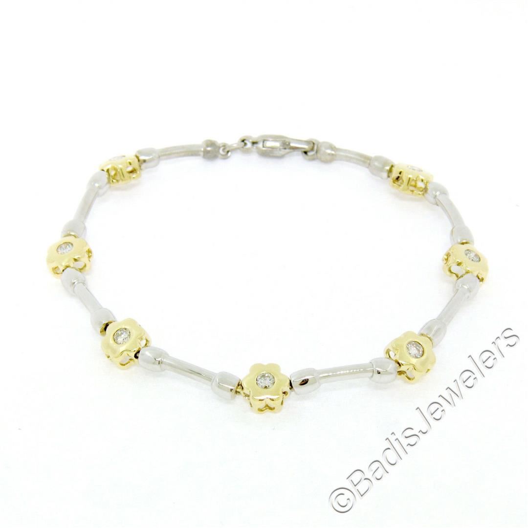 A like new 14kt gold bracelet with 0.50ctw of round diamonds (G/H - VS1/VS2) burnish set into yellow gold flower links which are connected with white gold barbell links. It weighs a total of 10.65 grams, measures 6.45mm wide, and measures 7.5 inches in length.