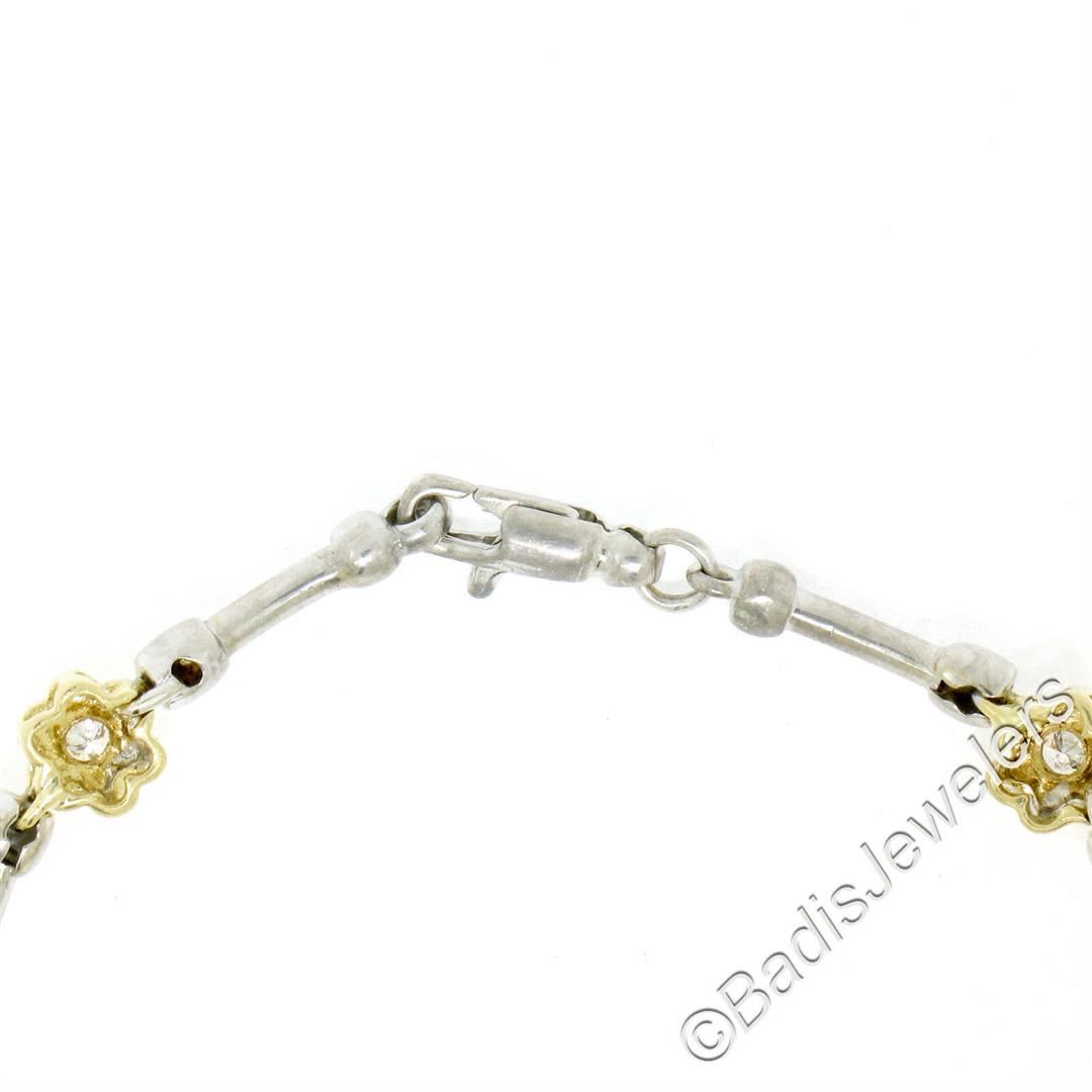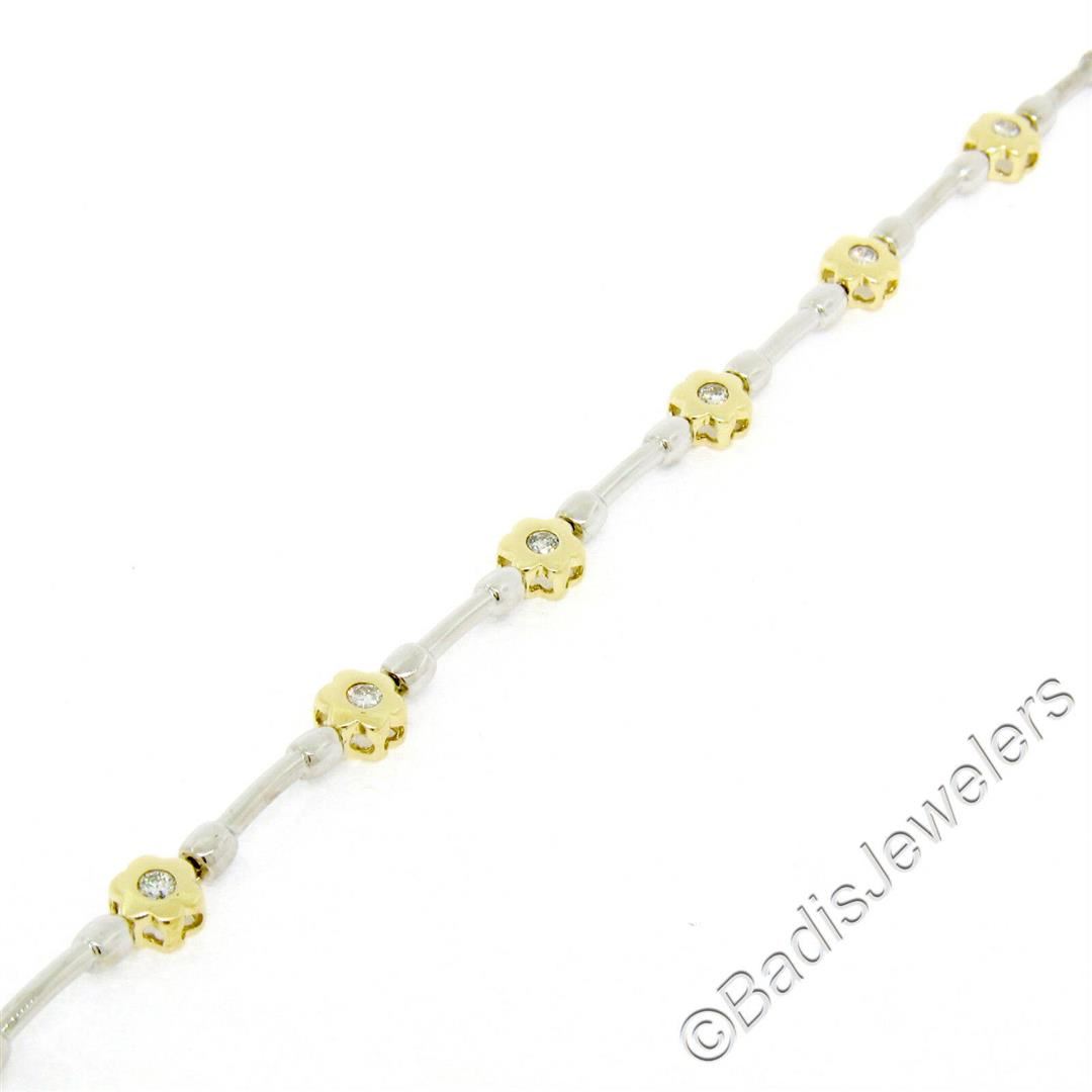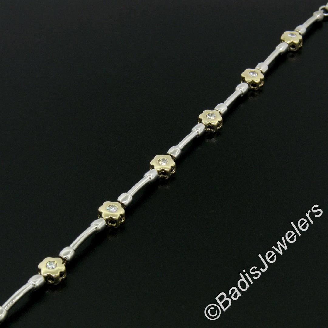 A like new 14kt gold bracelet with 0.50ctw of round diamonds (G/H - VS1/VS2) burnish set into yellow gold flower links which are connected with white gold barbell links. It weighs a total of 10.65 grams, measures 6.45mm wide, and measures 7.5 inches in length.