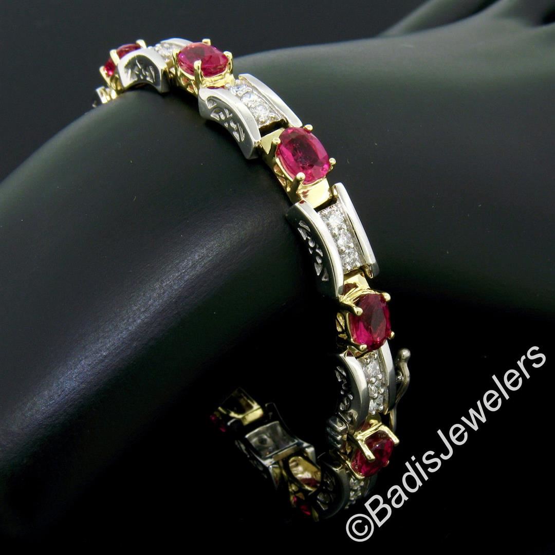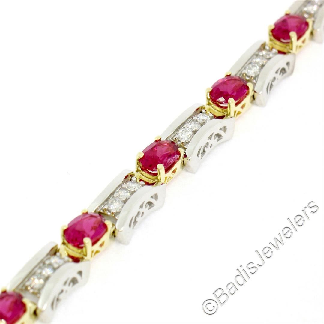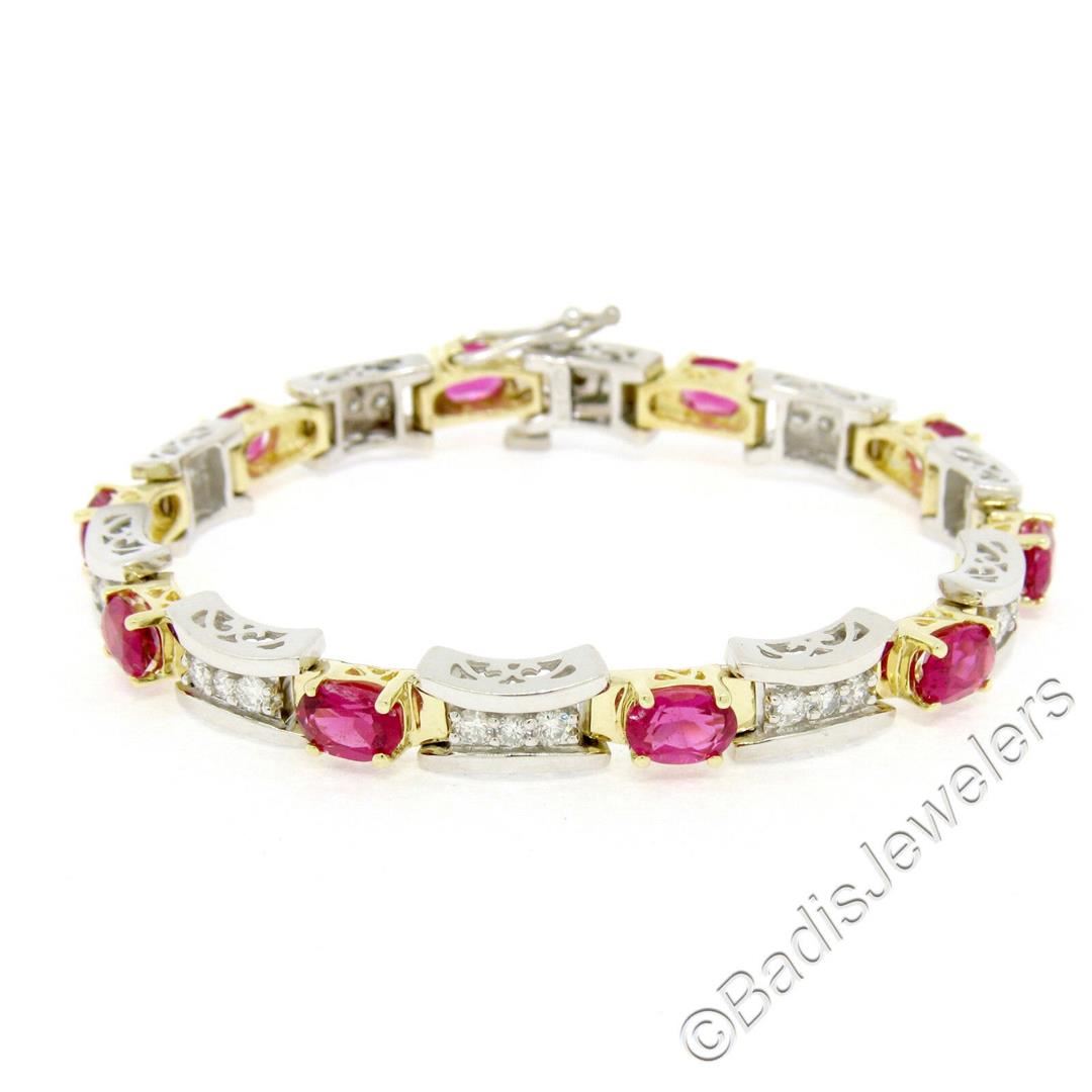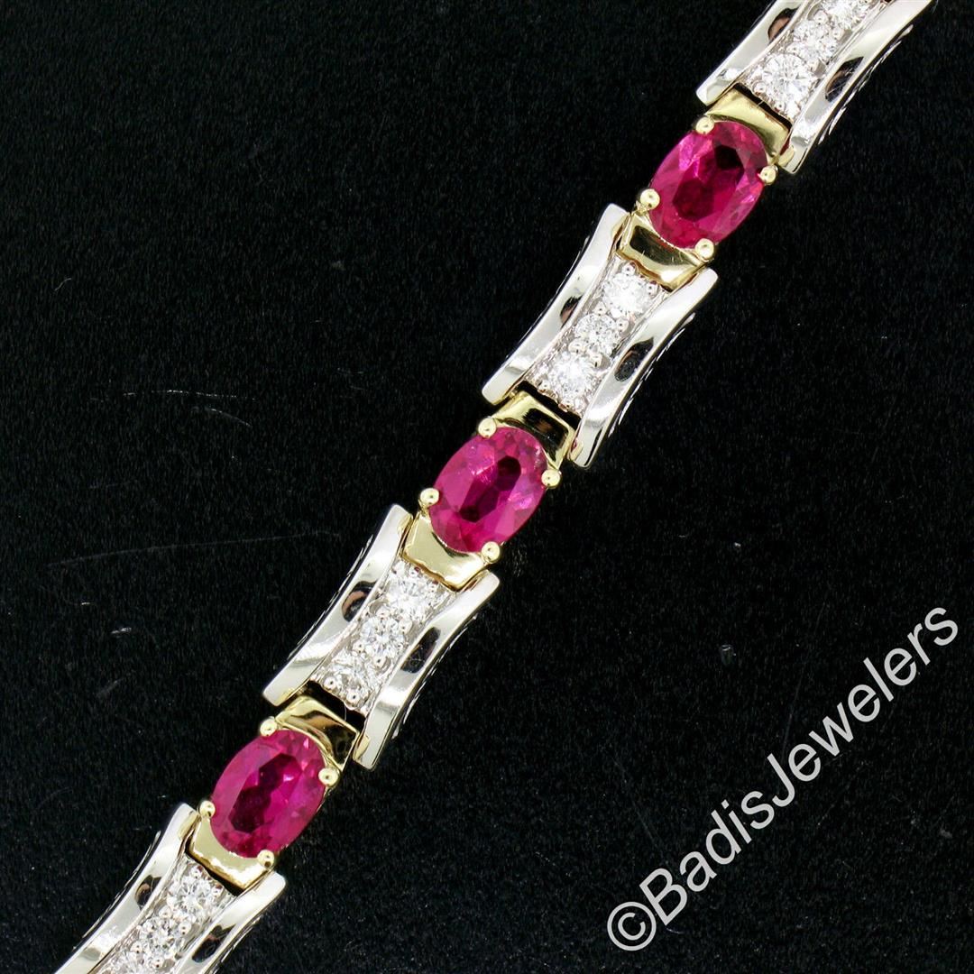 A like new 14kt gold bracelet with 9.0ctw of oval cut pink tourmalines prong set in yellow gold links and 1.60ctw of round diamonds set in white gold links. It weighs a total of 25.8 grams, measures 7.35mm wide, and fits up to a 7 inch wrist.
