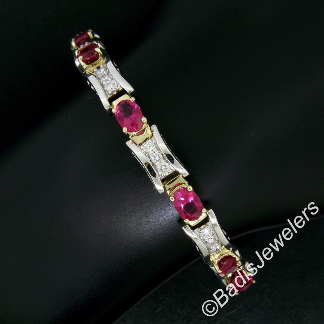 A like new 14kt gold bracelet with 9.0ctw of oval cut pink tourmalines prong set in yellow gold links and 1.60ctw of round diamonds set in white gold links. It weighs a total of 25.8 grams, measures 7.35mm wide, and fits up to a 7 inch wrist.