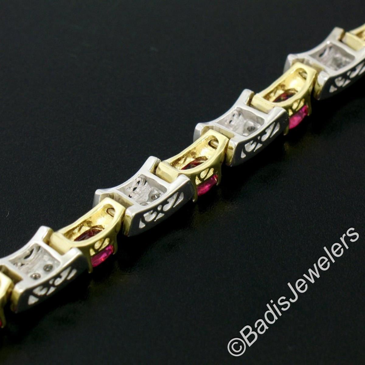 A like new 14kt gold bracelet with 9.0ctw of oval cut pink tourmalines prong set in yellow gold links and 1.60ctw of round diamonds set in white gold links. It weighs a total of 25.8 grams, measures 7.35mm wide, and fits up to a 7 inch wrist.