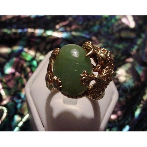 THIS IS A BEAUTIFUL 14kt YELLOW GOLD DRAGON AND JADE RING. THE RING IS HAND MADE AND IS A DRAGON RAPPING ITSELF AROUND A JADE STONE. THE RING WEIGHS 12.8g AND IS A SIZE 8 1/2. THIS IS A REAL WORK OF ART AND IS ANOTHER BEAUTIFUL RING BROUGHT TO YOU BY TASMARIE.