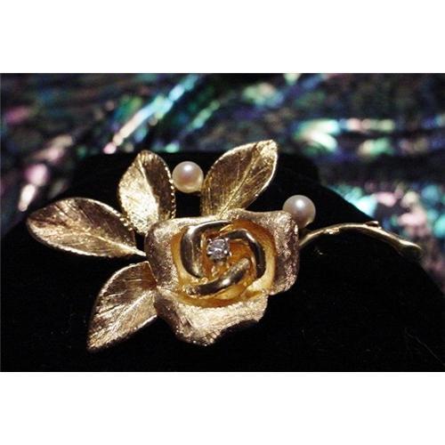 THIS IS A BEAUTIFUL 14kt YELLOW GOLD SCULPTED ROSE PIN, WITH DIAMONDS AND PEARLS. THE PIN WEIGHS 11.2g. ANOTHER BEAUTIFUL PIECE BROUGHT TO YOU BY TASMARIE.