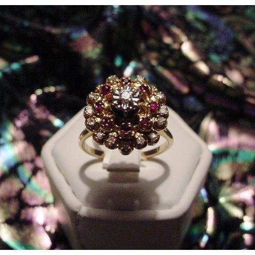 THIS BEAUTIFUL RING IS A CLUSTER OF RUBIES AND DIAMONDS SET IN 14kt YELLOW GOLD. THE RING IS A SIZE 7. ANOTHER WONDERFUL PIECE BROUGHT TO YOU BY TASMARIE.