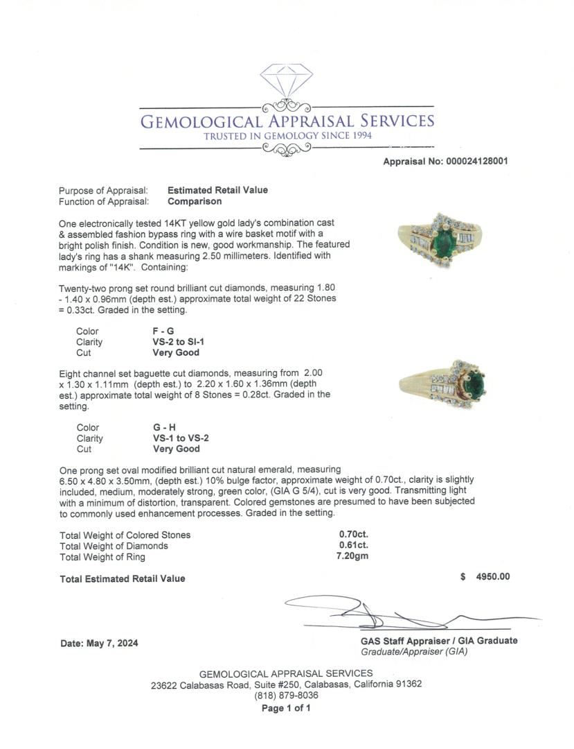 This 14KT yellow gold bypass ring showcases an oval modified brilliant-cut natural emerald weighing 0.70ct, displaying a medium green color with slight inclusions. Flanking the emerald are twenty-two round brilliant-cut diamonds totaling 0.33ct and eight channel-set baguette-cut diamonds weighing 0.28ct. The wire basket motif and polished finish highlight its sophisticated craftsmanship.
