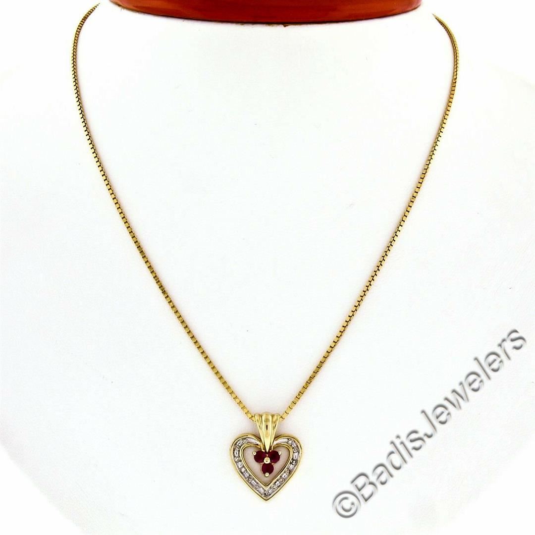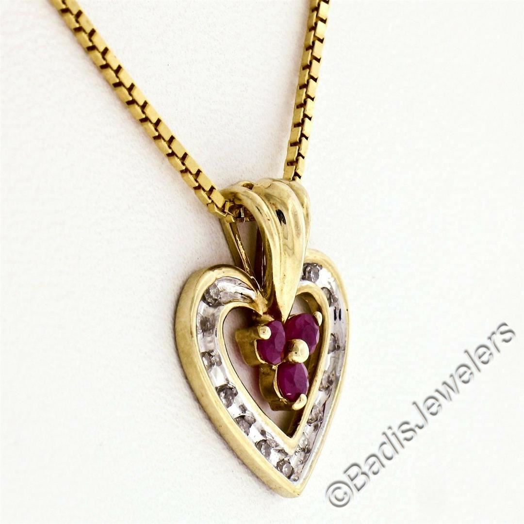 A 14kt yellow gold open heart pendant with 0.36ctw round rubies and 0.15ctw round diamonds (G/H - VS2/SI1). 16 inch box link chain, 4.95 grams total weight, measures 18.95x15.55mm.