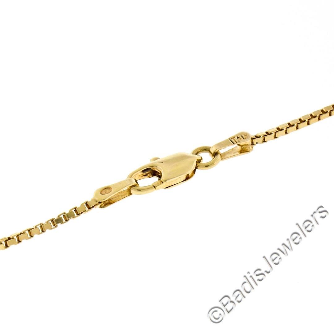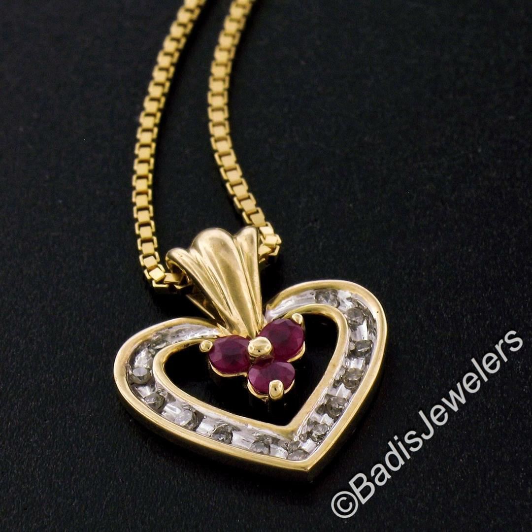 A 14kt yellow gold open heart pendant with 0.36ctw round rubies and 0.15ctw round diamonds (G/H - VS2/SI1). 16 inch box link chain, 4.95 grams total weight, measures 18.95x15.55mm.