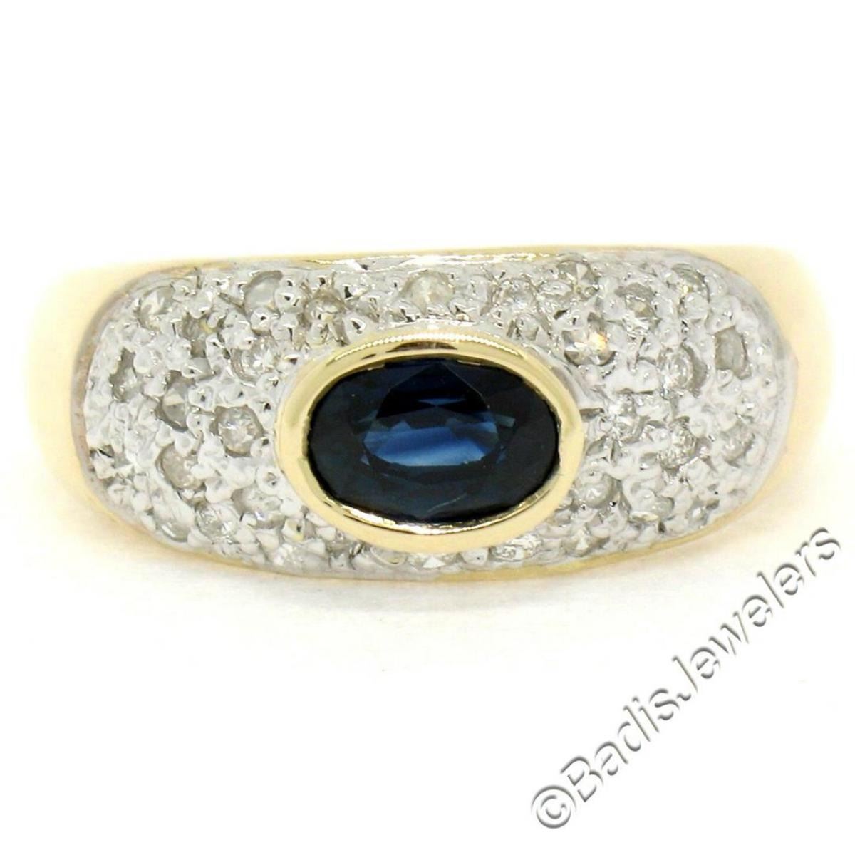 A like new 14kt yellow gold band ring with a 0.60ct oval cut sapphire surrounded by 0.25ctw of round diamonds (H/I - SI2/I1). The ring is size 7, weighs a total of 4.2 grams, and measures approximately 8.25mm wide.