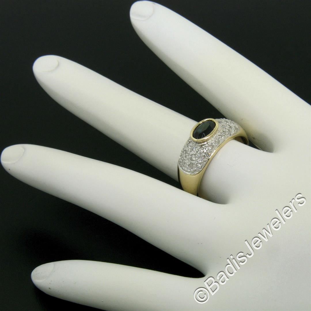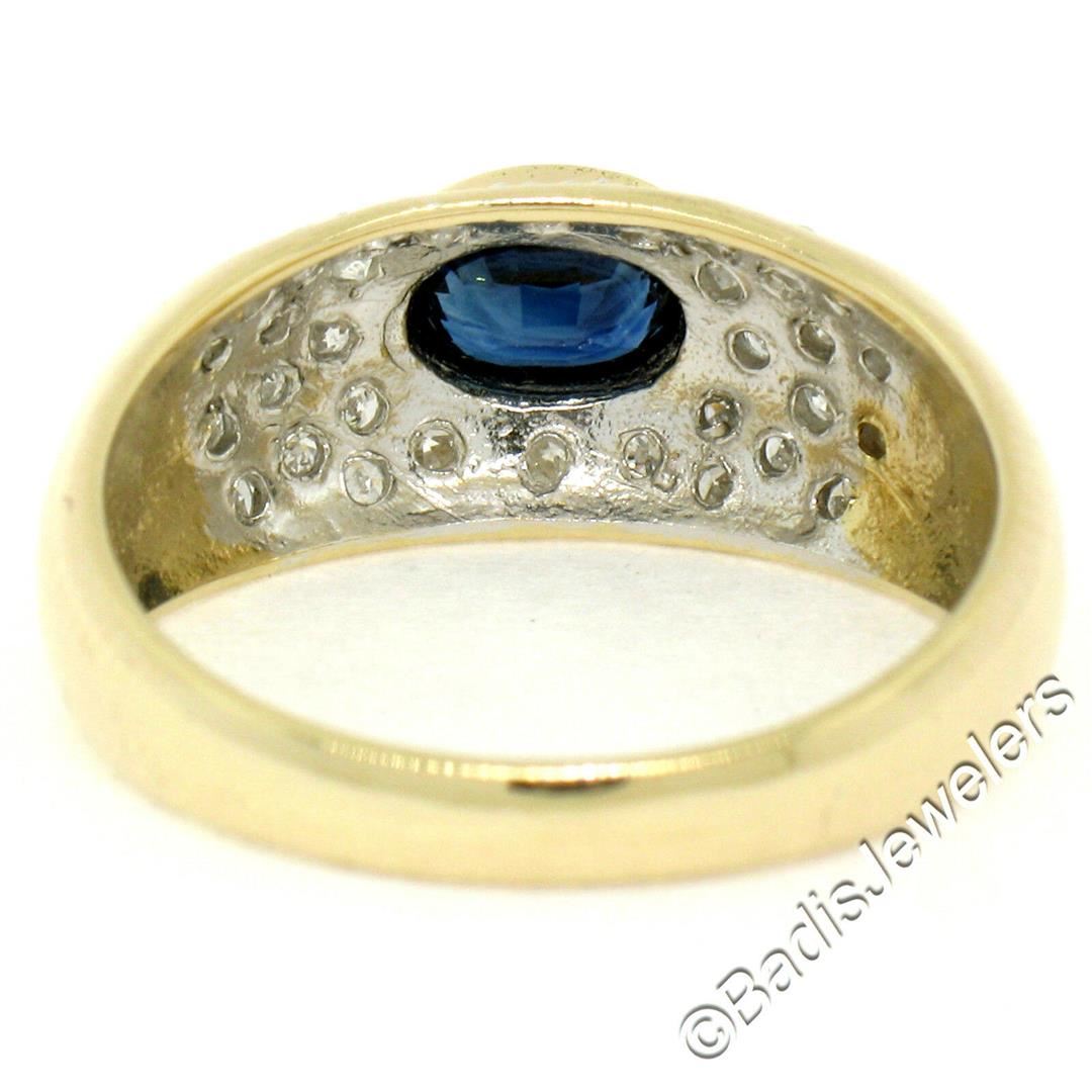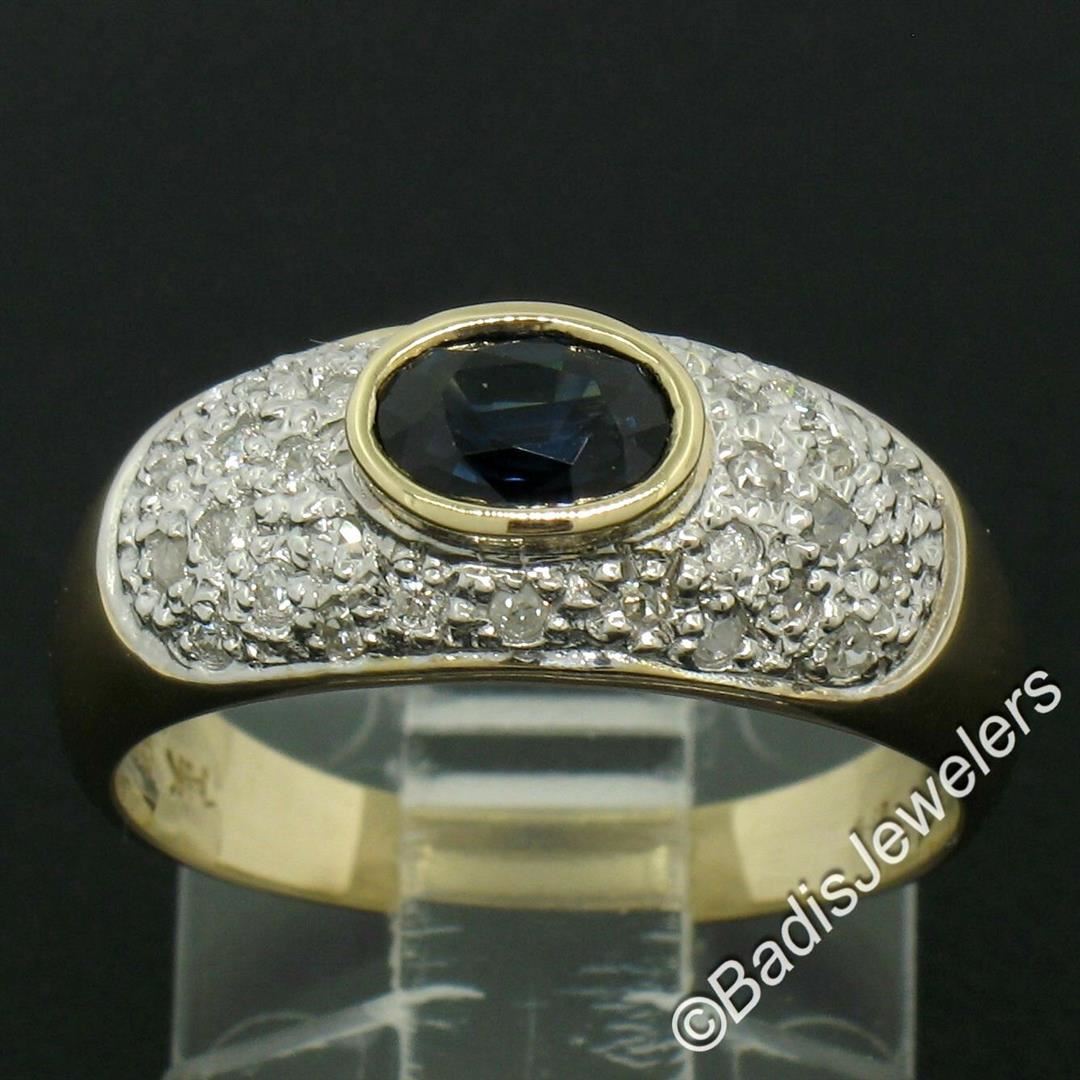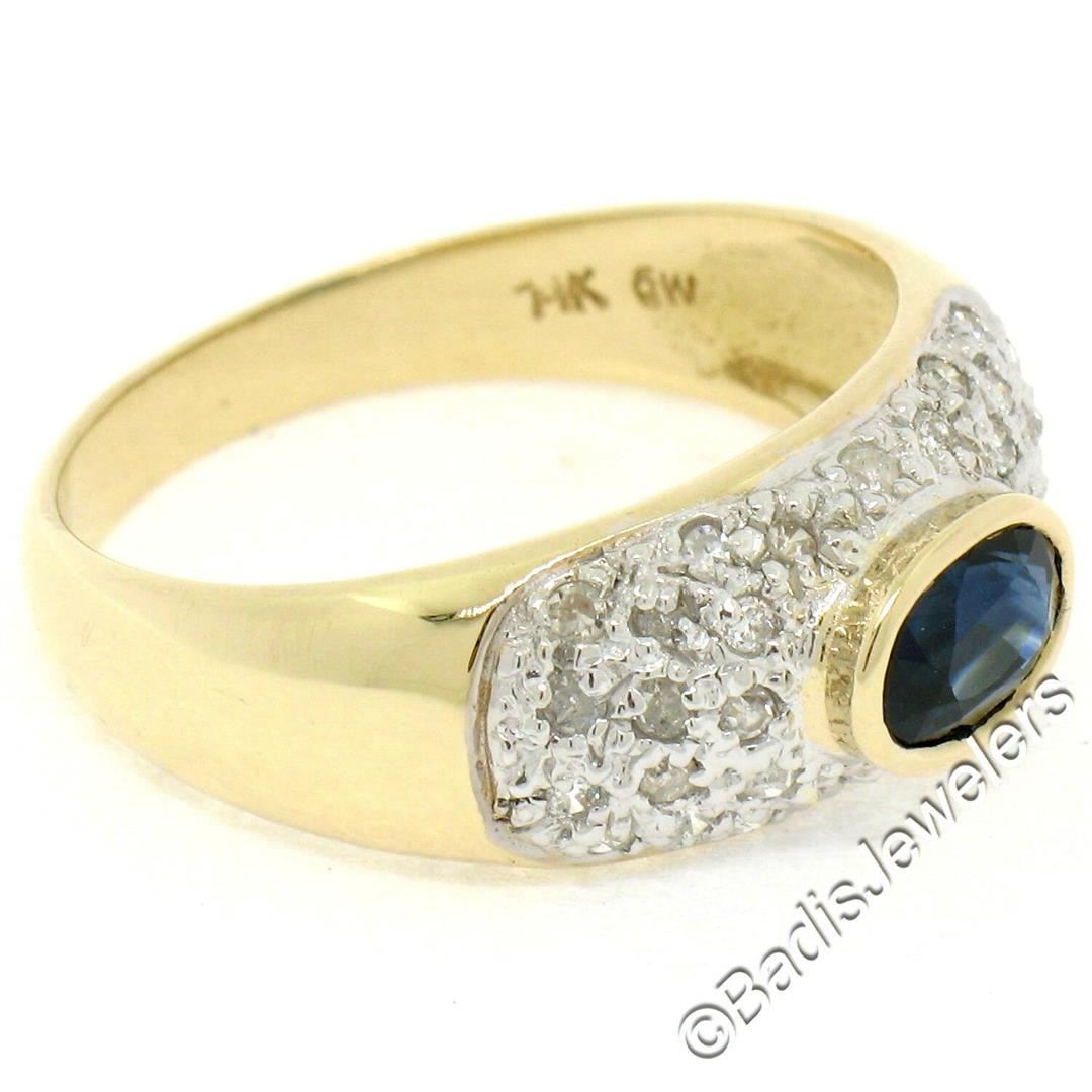 A like new 14kt yellow gold band ring with a 0.60ct oval cut sapphire surrounded by 0.25ctw of round diamonds (H/I - SI2/I1). The ring is size 7, weighs a total of 4.2 grams, and measures approximately 8.25mm wide.