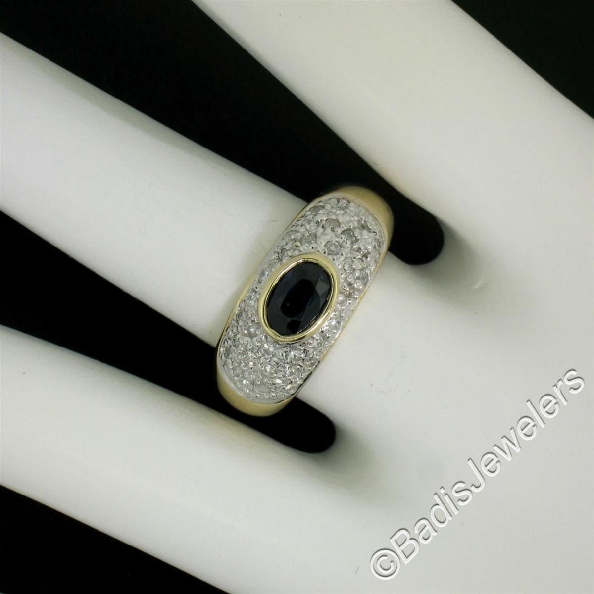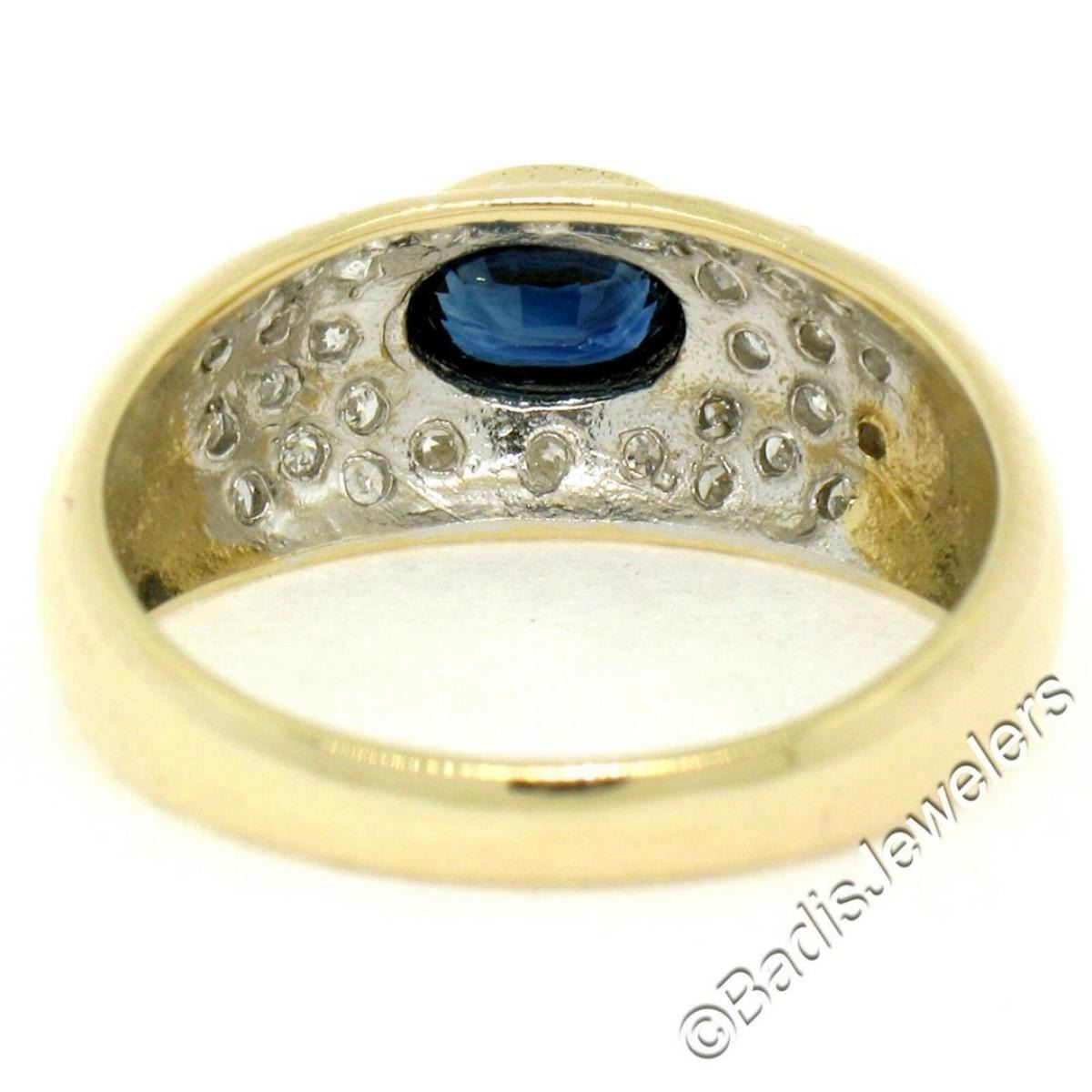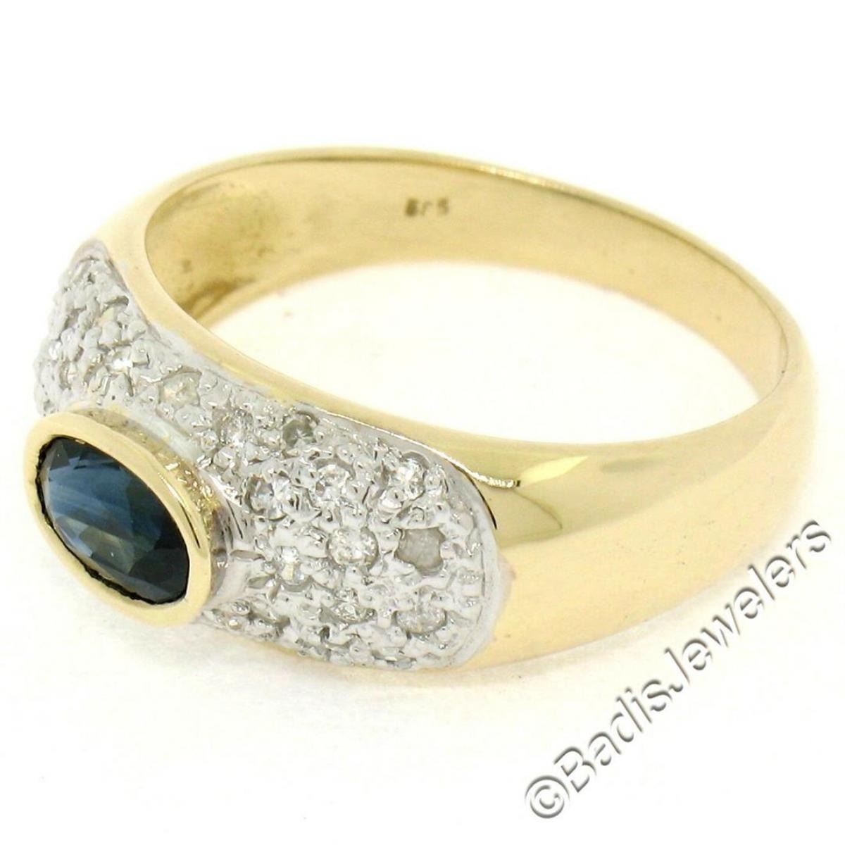 A like new 14kt yellow gold band ring with a 0.60 ct oval cut sapphire surrounded by 0.25ctw of round diamonds (H/I - SI2/I1). The ring is size 7, weighs a total of 4.2 grams, and measures approximately 8.25mm wide.