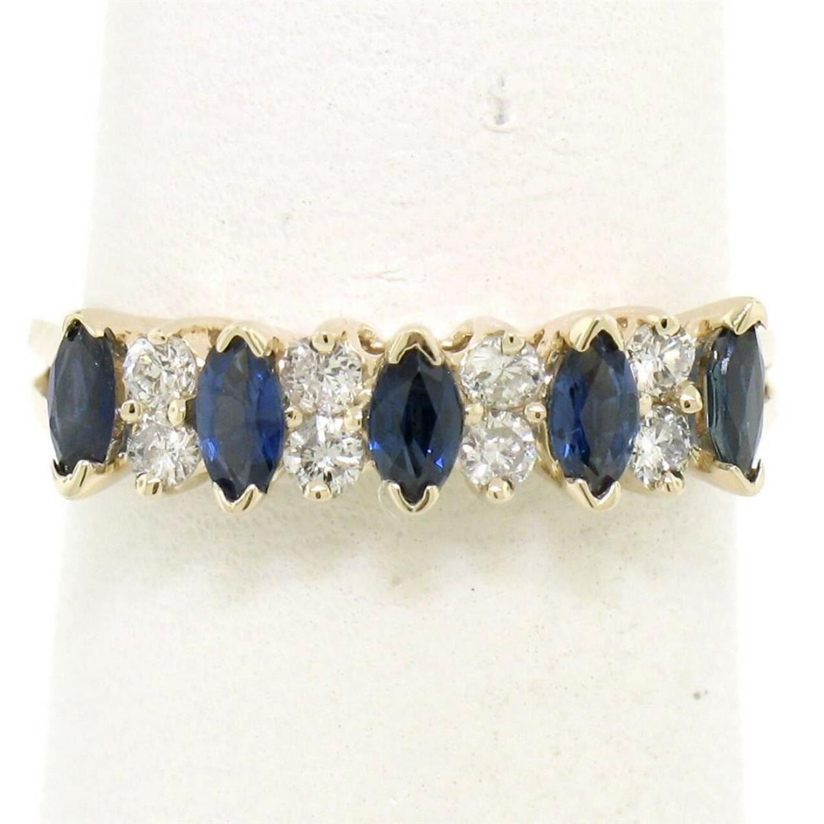A 14kt yellow gold band ring featuring 0.70ctw of marquise cut sapphires accented by 0.28ctw of round brilliant diamonds (G/H - VS2/SI1). The ring is size 5.75, weighs a total of 2.09 grams, and measures 4.83mm wide.