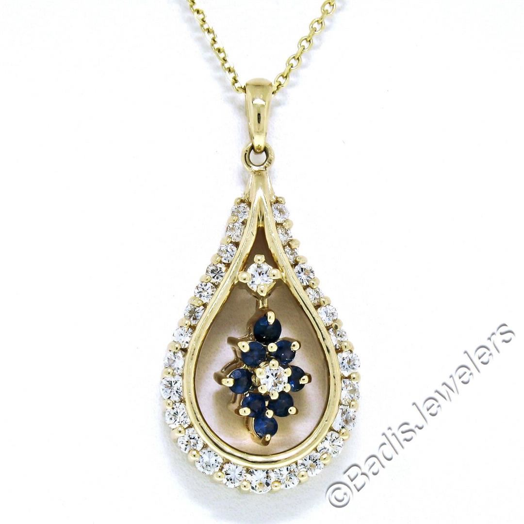 A like new 14kt yellow gold tear drop pendant set with 0.32ctw of round sapphires and 0.90ctw of round diamonds (F/G - VS1/VS2). With 20 inch cable link chain, 7.13 grams total weight, measures 28.25x15.70mm.