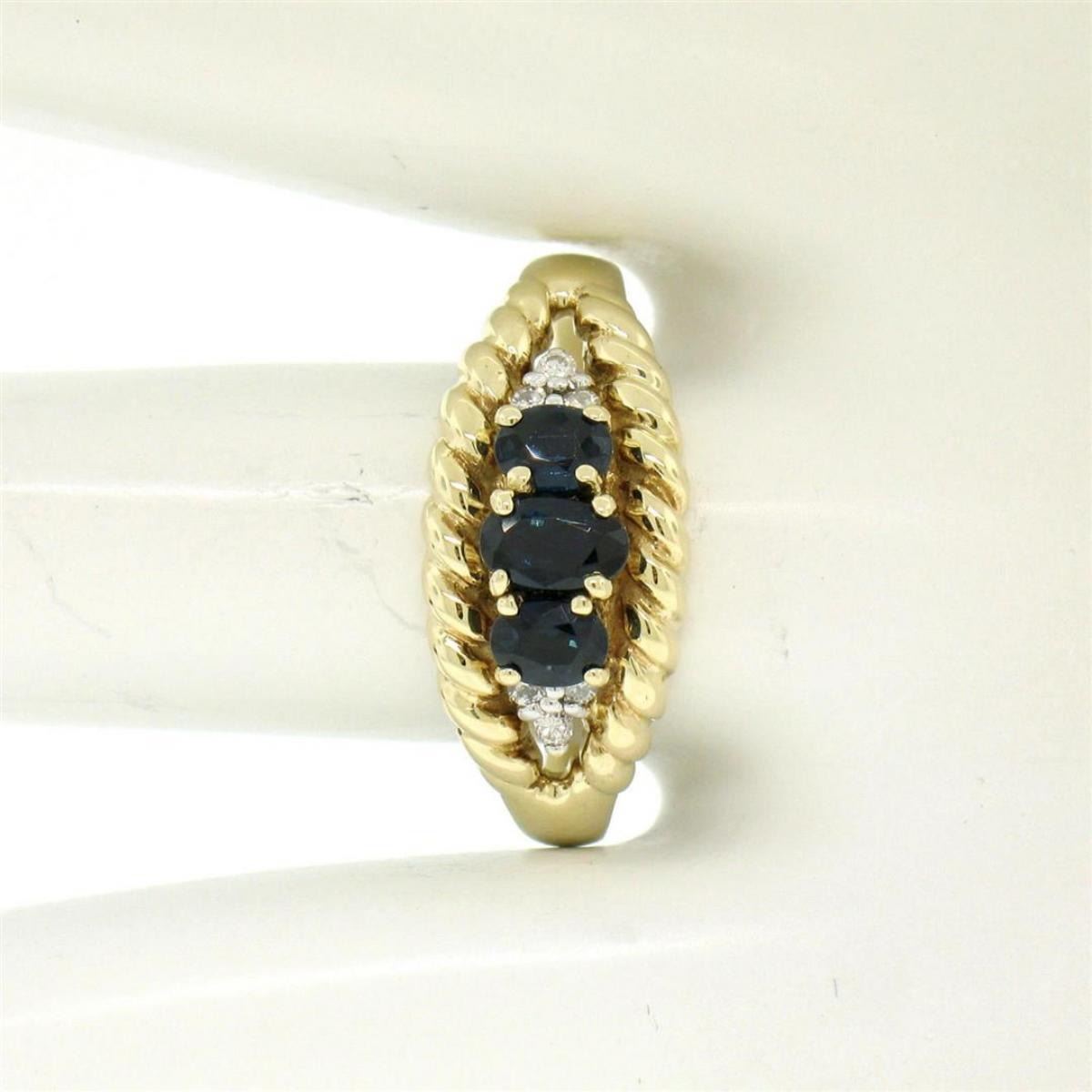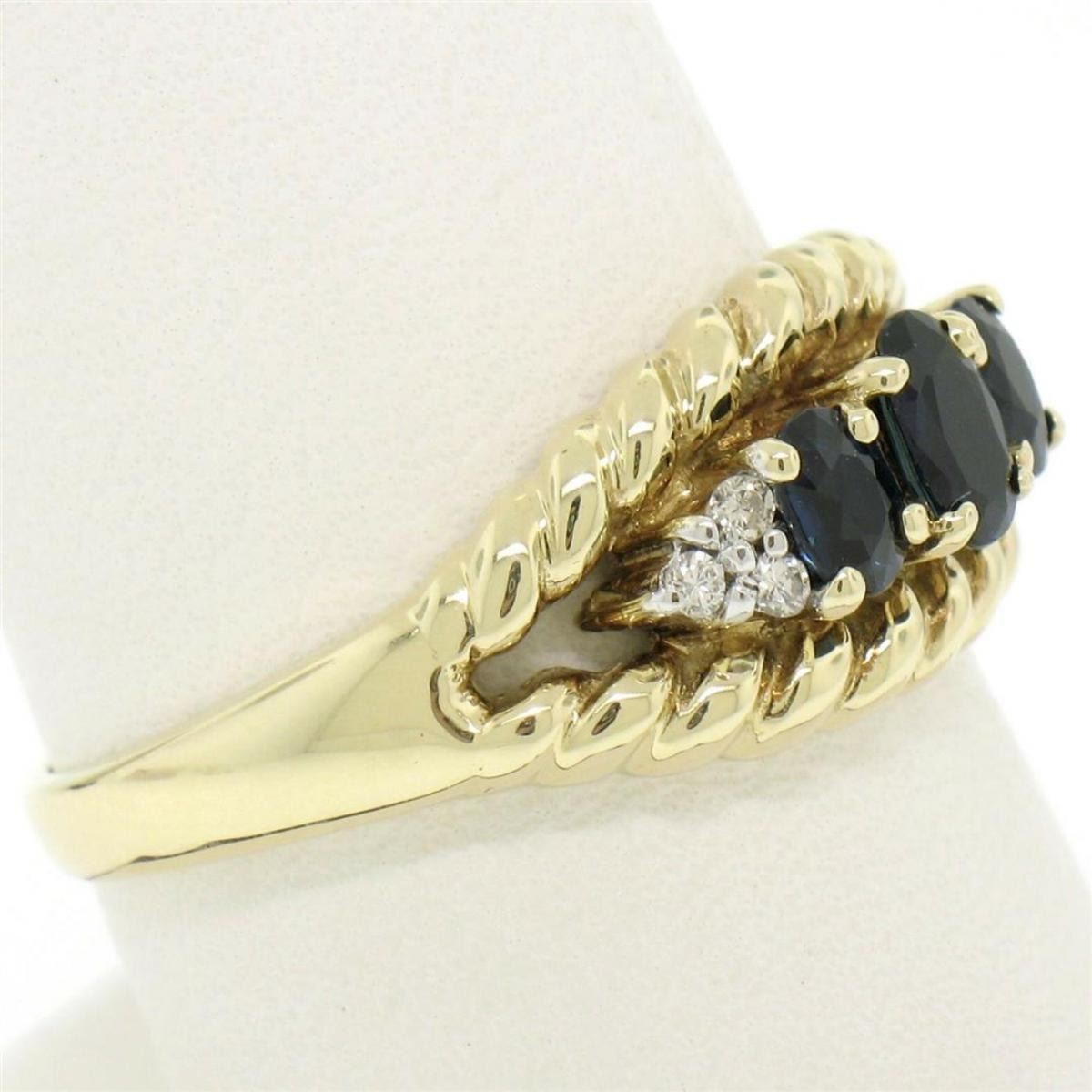 A like new 14kt yellow gold band ring with 1.40ctw of oval cut sapphires accented by 0.06ctw of round diamonds (H - SI1). The ring is size 8.5, weighs a total of 4.2 grams, and measures approximately 9.5mm wide.