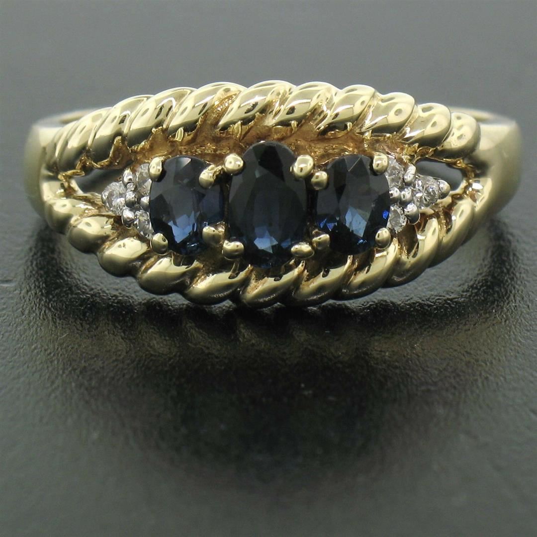 A like new 14kt yellow gold band ring with 1.40ctw of oval cut sapphires accented by 0.06ctw of round diamonds (H - SI1). The ring is size 8.5, weighs a total of 4.2 grams, and measures approximately 9.5mm wide.