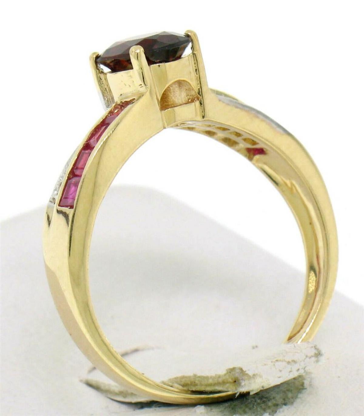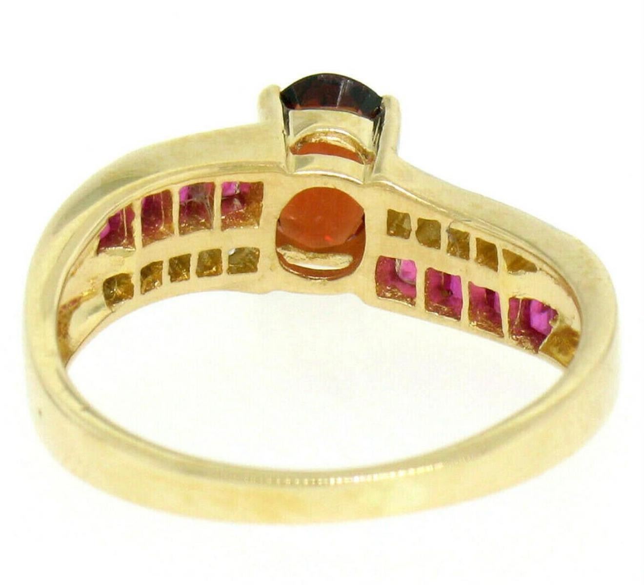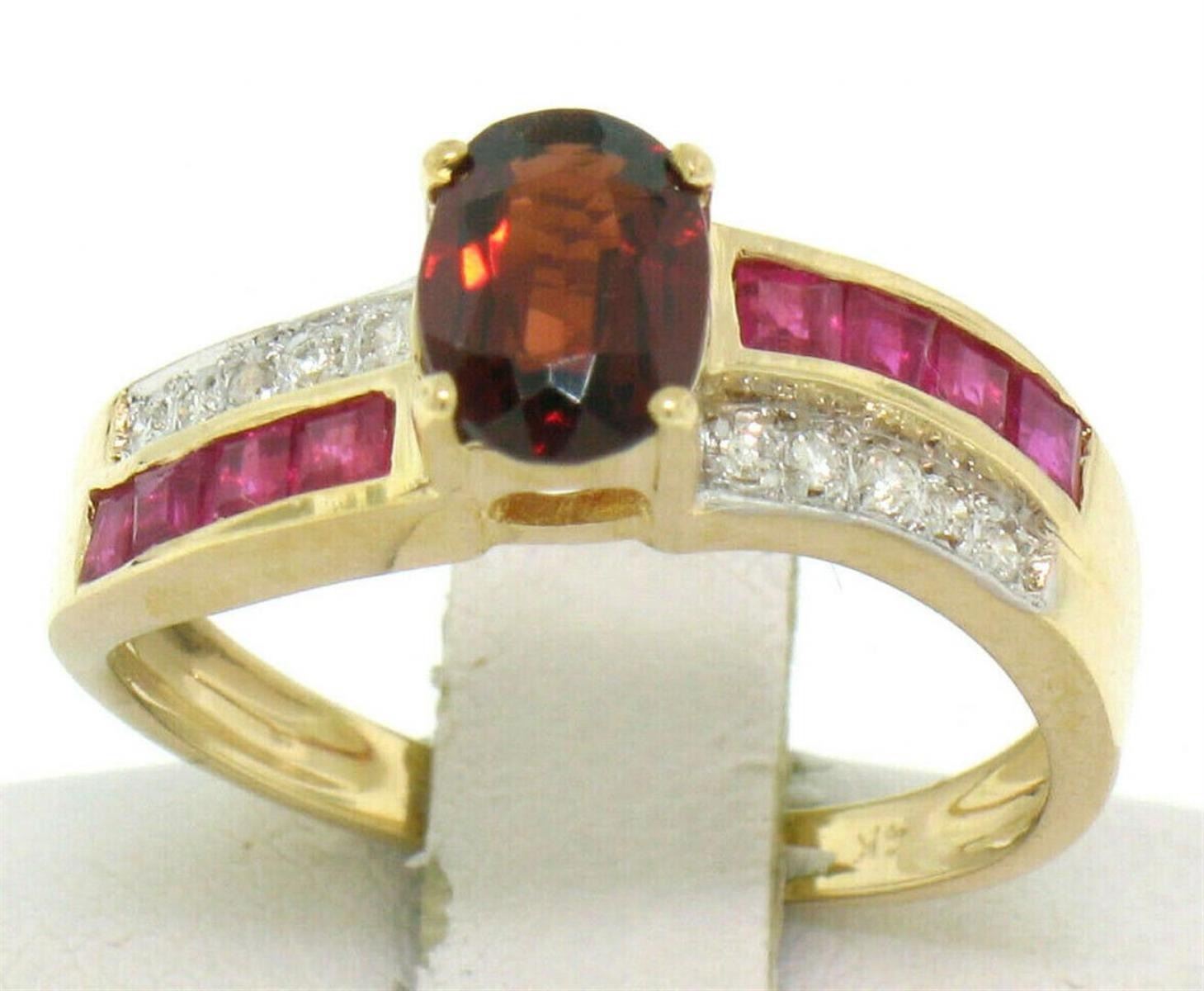 A 14kt yellow gold ring featuring a 1.00ct oval cut garnet, 0.48ctw of princess cut rubies, and 0.10ctw of round brilliant diamonds. The ring is size 5.5, weighs a total of 3.3 grams, and measures 7.00mm wide.