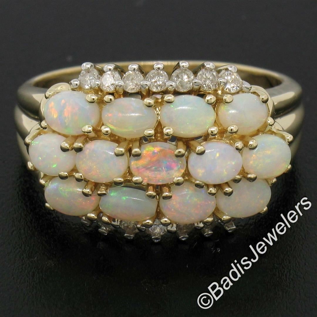 A 14kt yellow gold wide band cluster ring with oval opals and 0.25ctw of round diamonds (H/I - SI1/SI2). The ring is size 9.0, weighs a total of 6.09 grams, and measures 13.7mm wide.