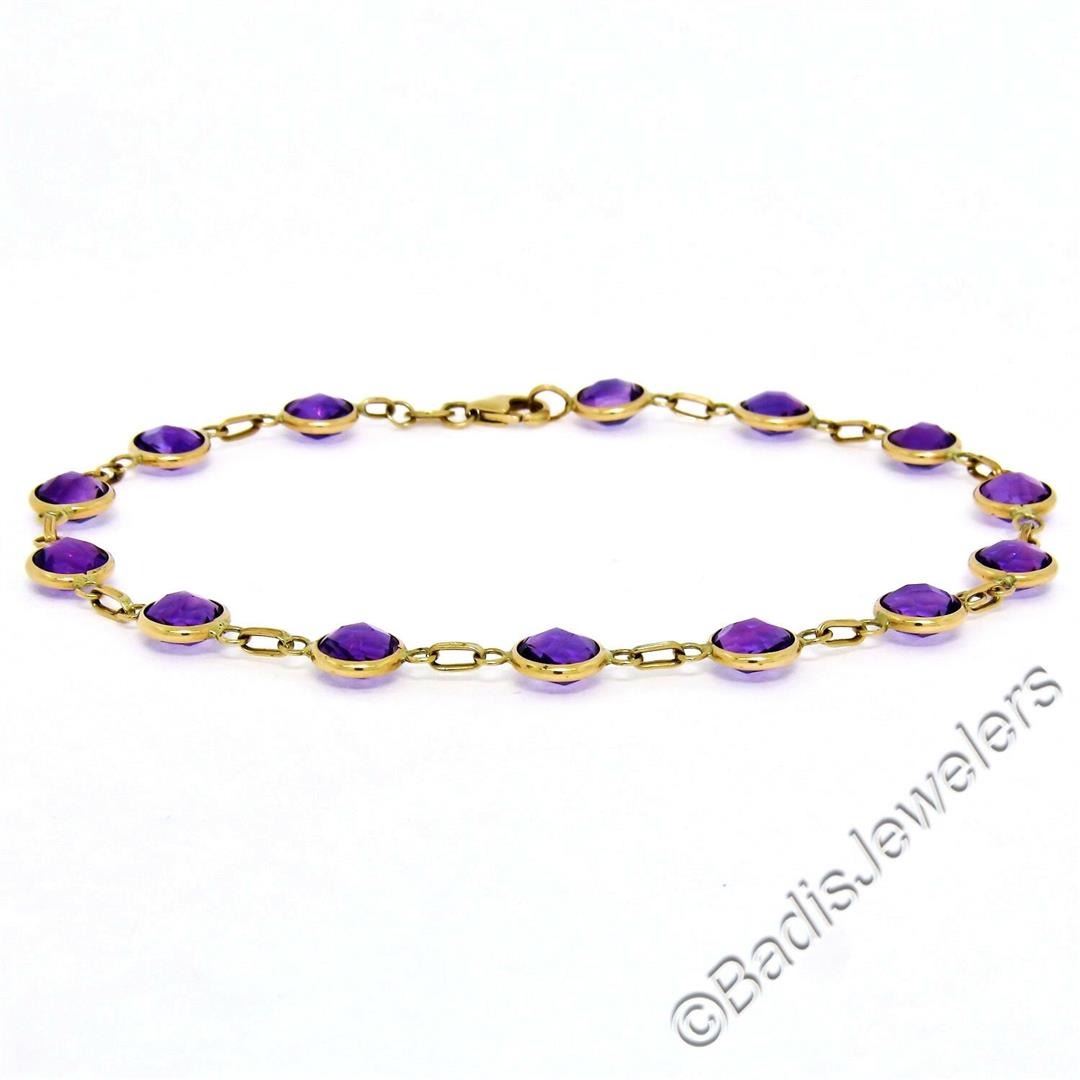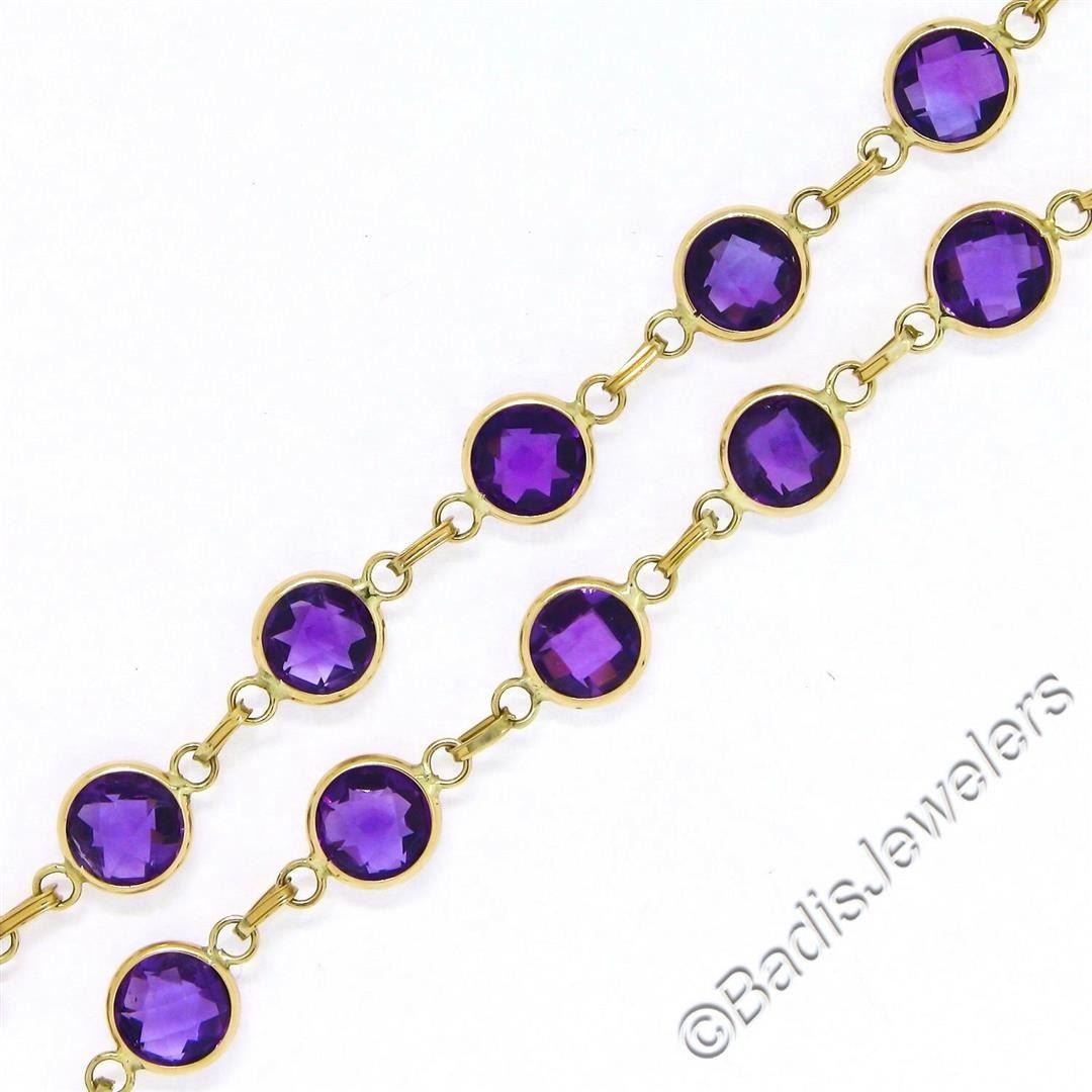 A like new 14kt yellow gold "By the Yard" style bracelet bezel set with 10.50ctw of round checkerboard cut amethysts. It weighs a total of 4.14 grams, measures 6.65mm wide, and measures 8 inches in length.
