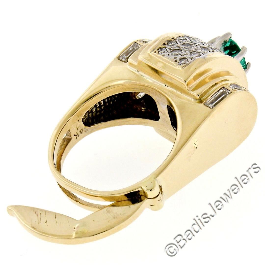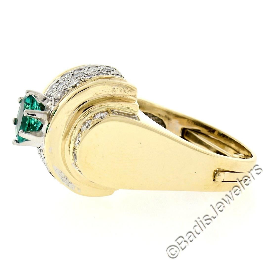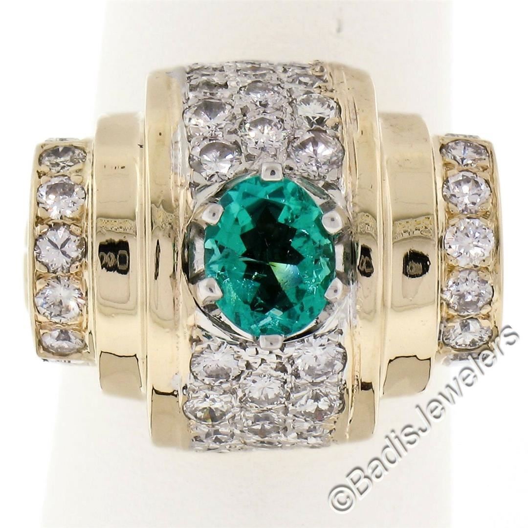 A 14kt yellow gold cocktail ring with an arthritic shank set with a natural 0.60ct oval cut emerald and accented by 1.50ctw of round and baguette cut diamonds (G/H - VS1 to SI1). The ring is size 4.0, weighs a total of 13.3 grams, and measures 16.50mm wide.
