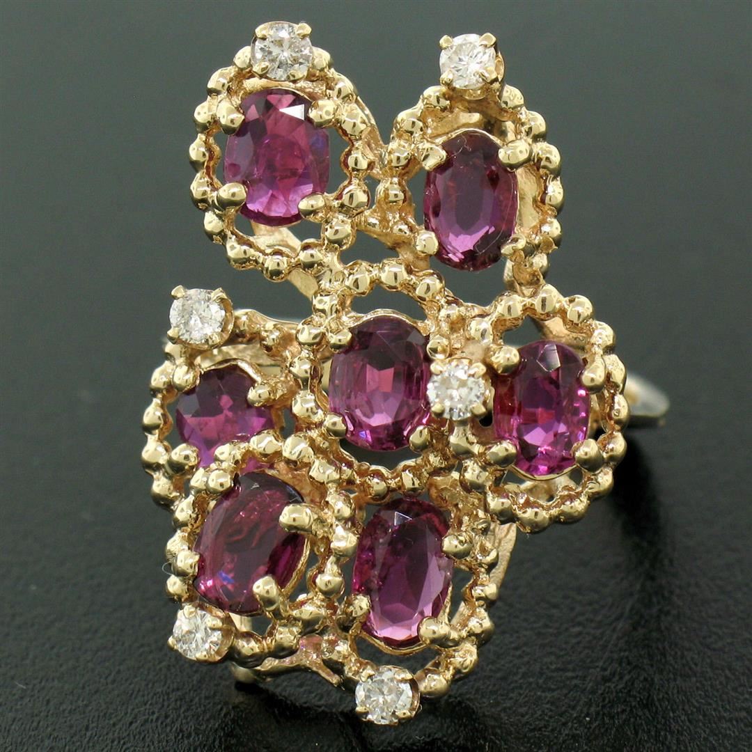 A 14kt yellow gold cluster cocktail ring featuring 1.96ctw of oval cut rubies accented by 0.18ctw of round brilliant diamonds (F/G - SI1). The ring is size 7.0, weighs a total of 6.49 grams, and measures 25.37mm wide.