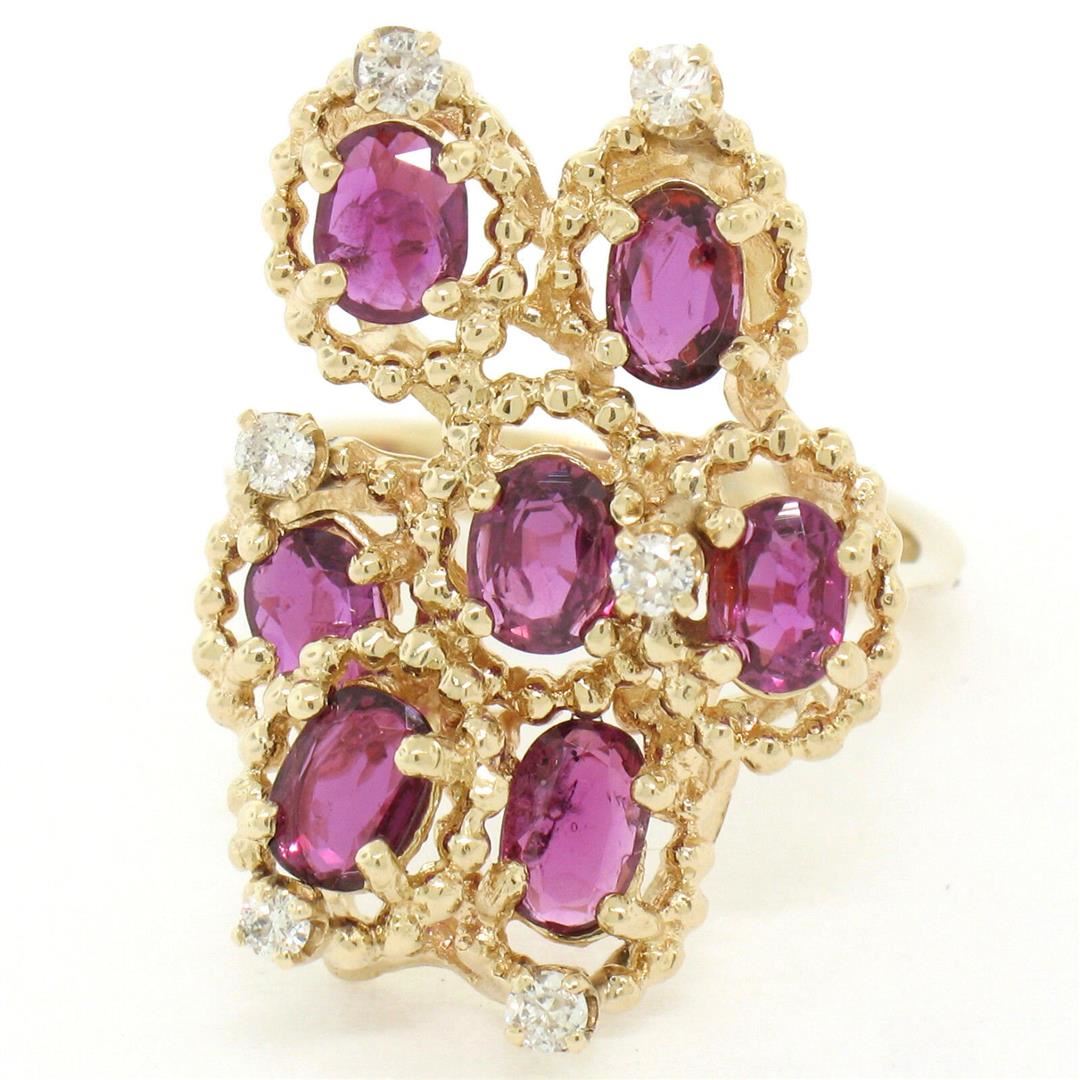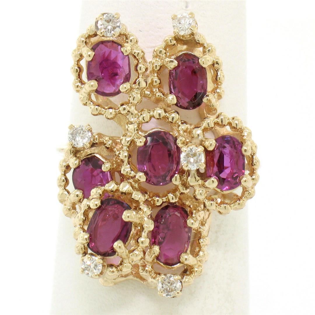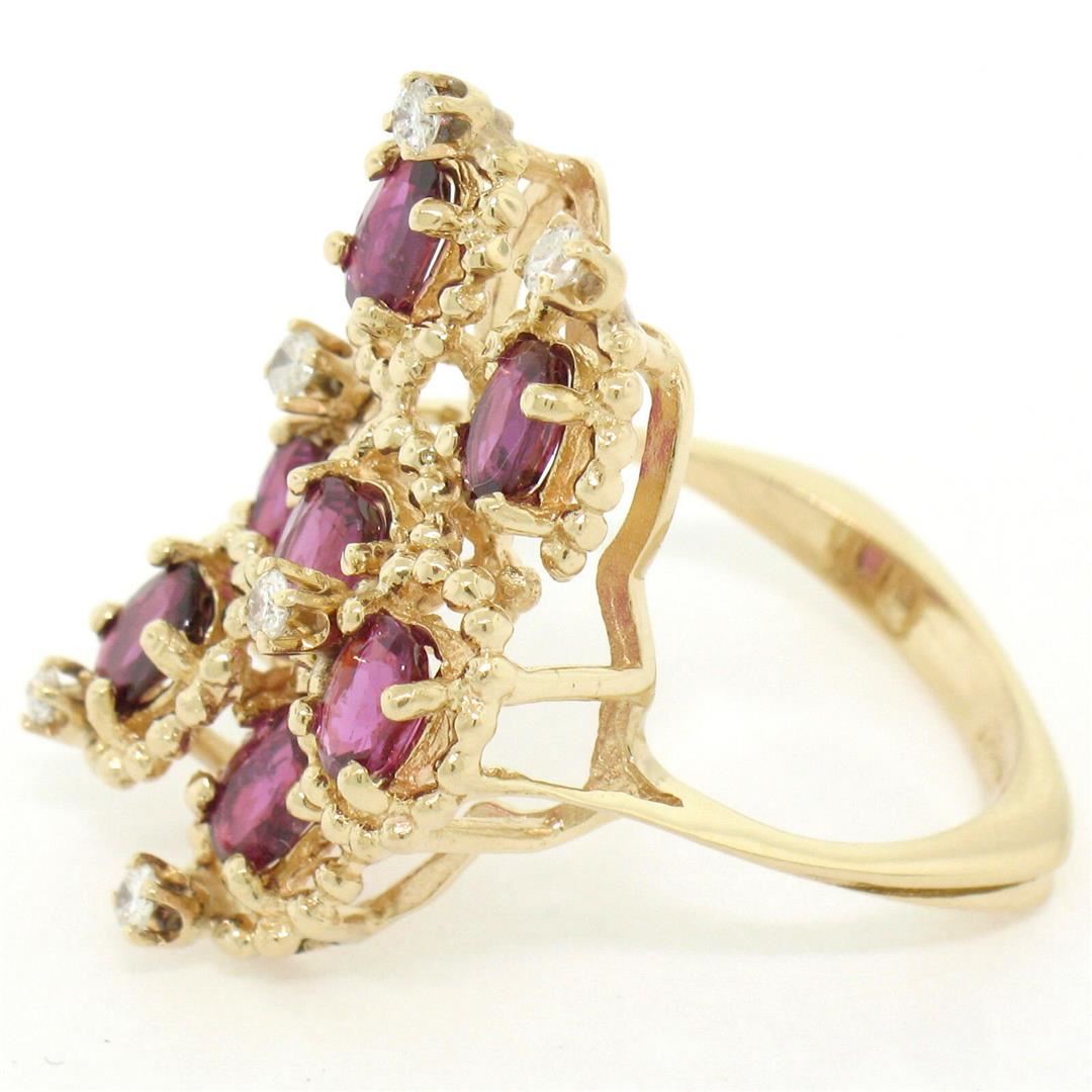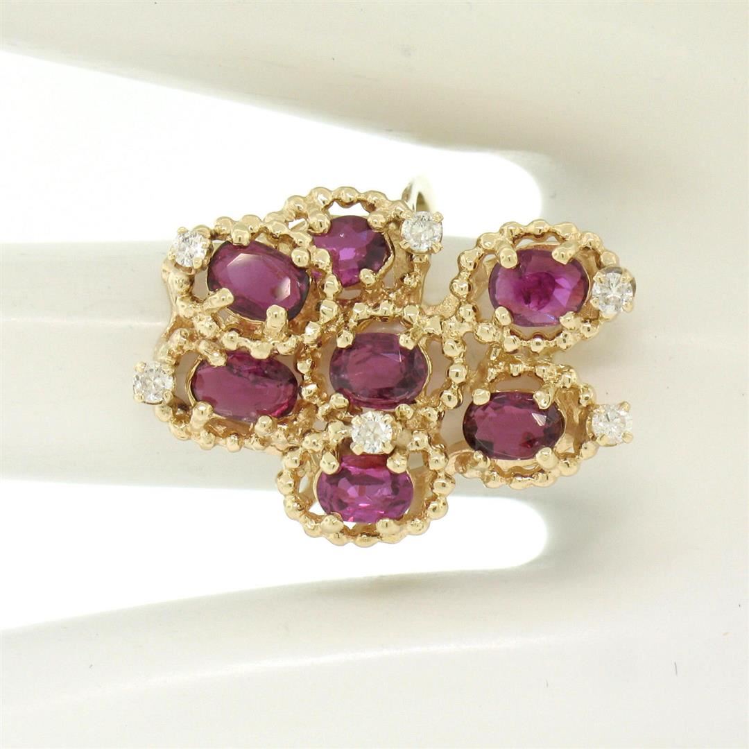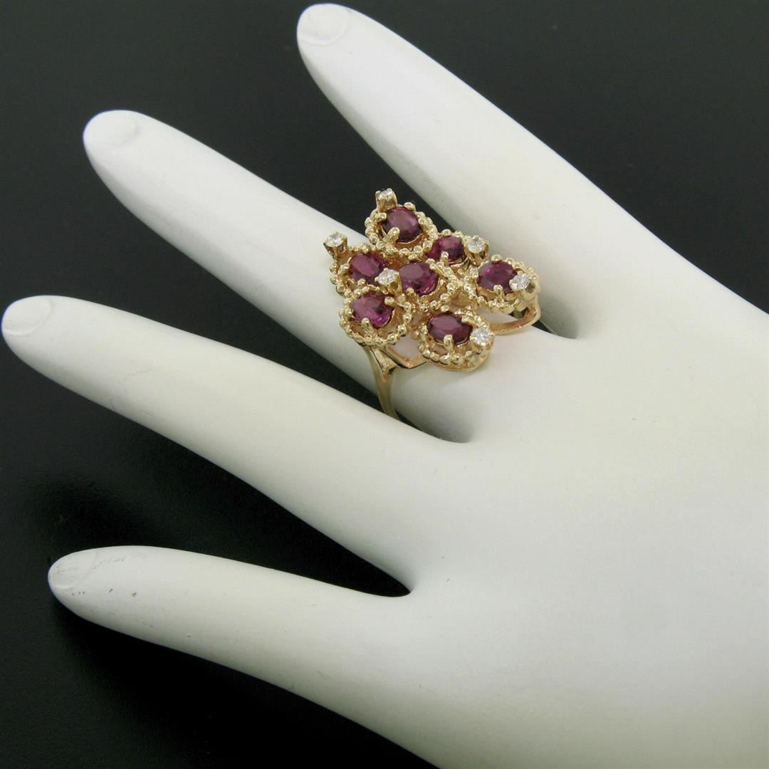 A 14kt yellow gold cluster cocktail ring featuring 1.96ctw of oval cut rubies accented by 0.18ctw of round brilliant diamonds (F/G - SI1). The ring is size 7.0, weighs a total of 6.49 grams, and measures 25.37mm wide.