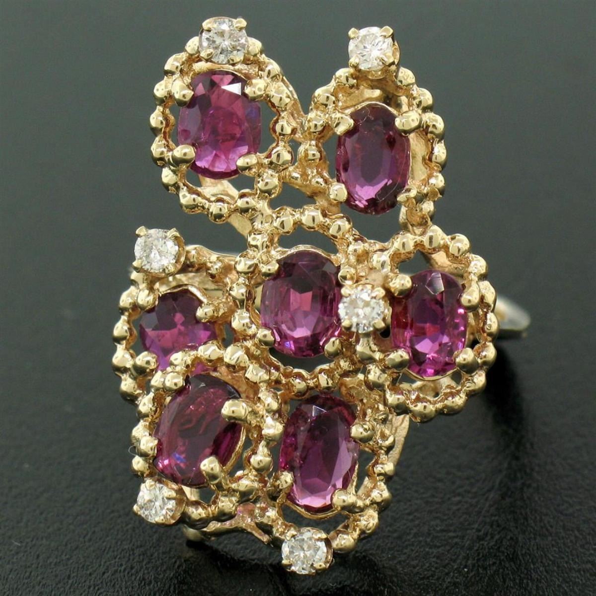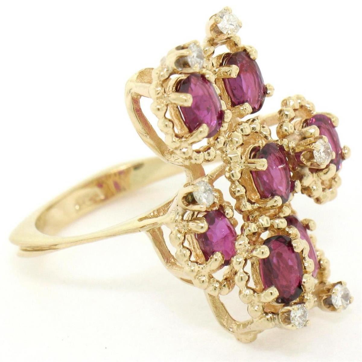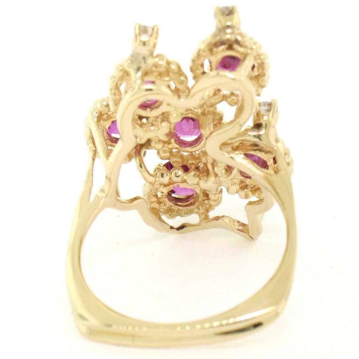 A 14kt yellow gold cluster cocktail ring featuring 1.96ctw of oval cut rubies accented by 0.18ctw of round brilliant diamonds (F/G - SI1). The ring is size 7.0, weighs a total of 6.49 grams, and measures 25.37mm wide.