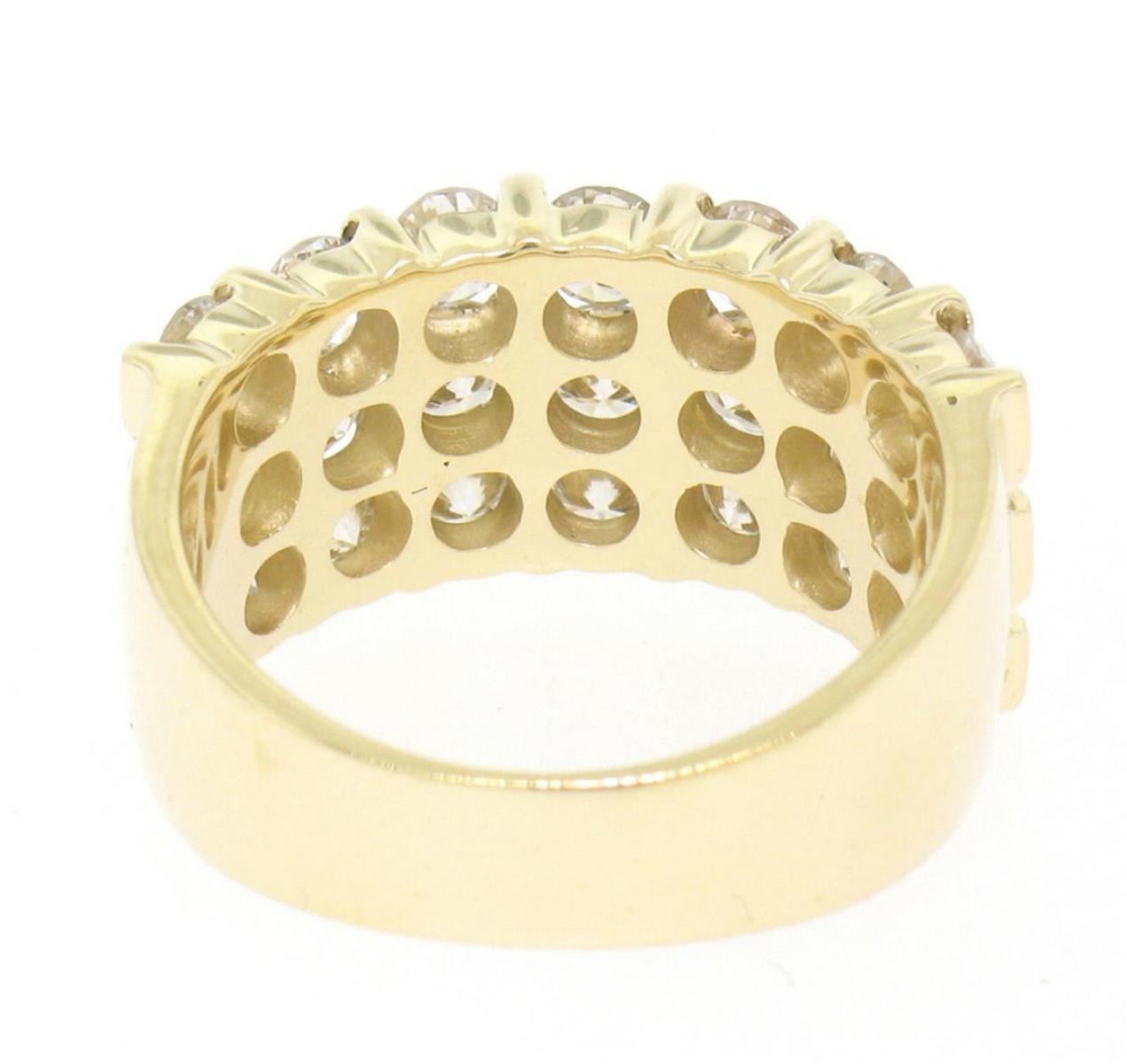 A brand new 14kt yellow gold band ring bar set with 2.52ctw of round diamonds (F - VS2). The ring is size 5, weighs a total of 8.6 grams, and measures 10.2mm wide.