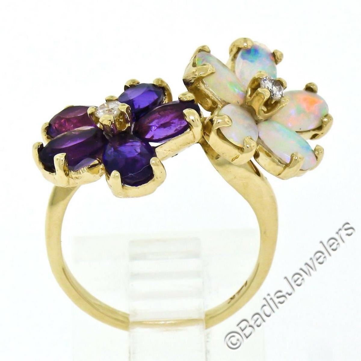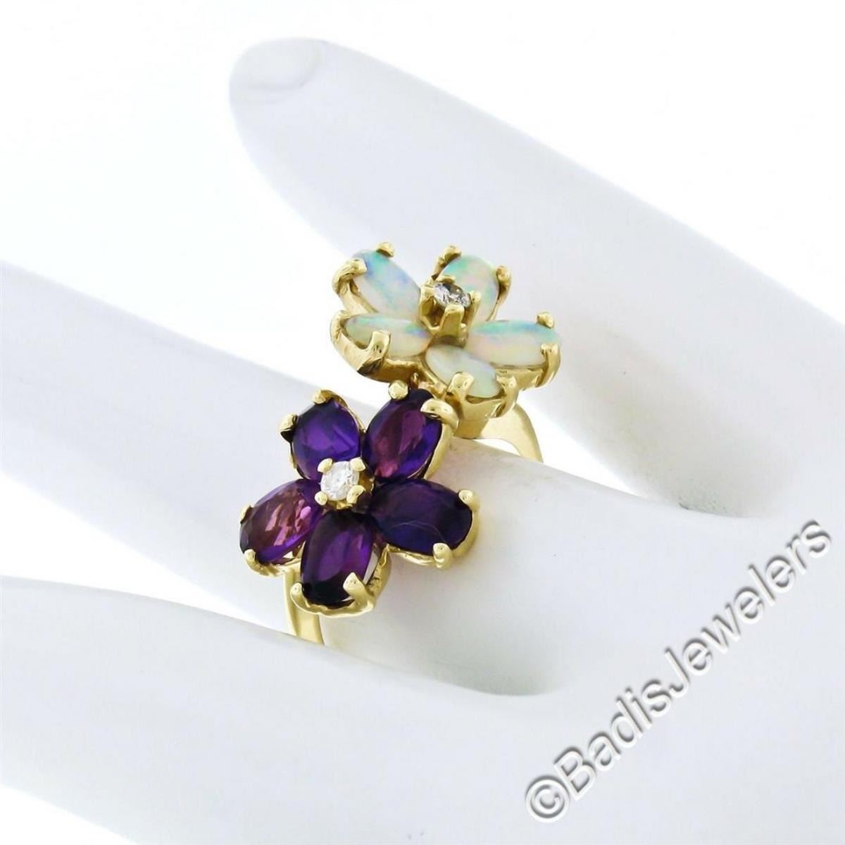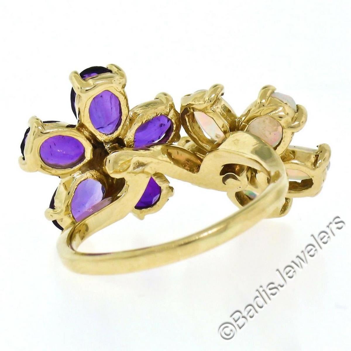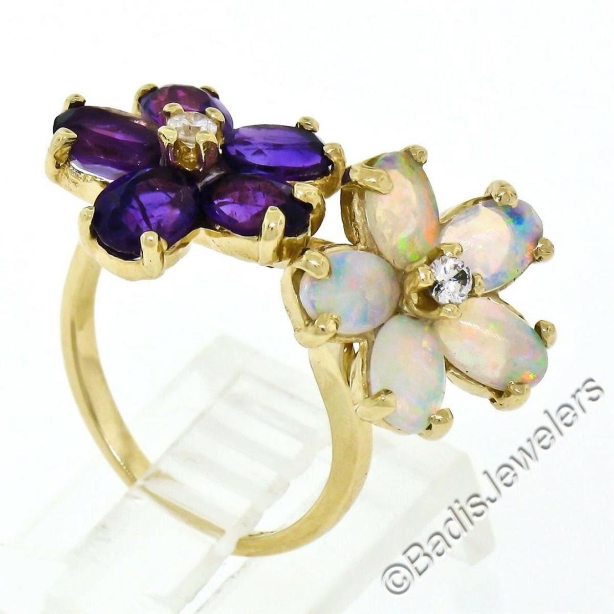A like new 14kt yellow gold ring with dual flower clusters of oval amethysts (1.50ctw) and oval cabochon opals (1.10ctw) accented by 0.10ctw of round diamonds (G/H - VS2). The ring is size 5.5, weighs a total of 4.8 grams, and the top measures approximately 13.65mm wide.