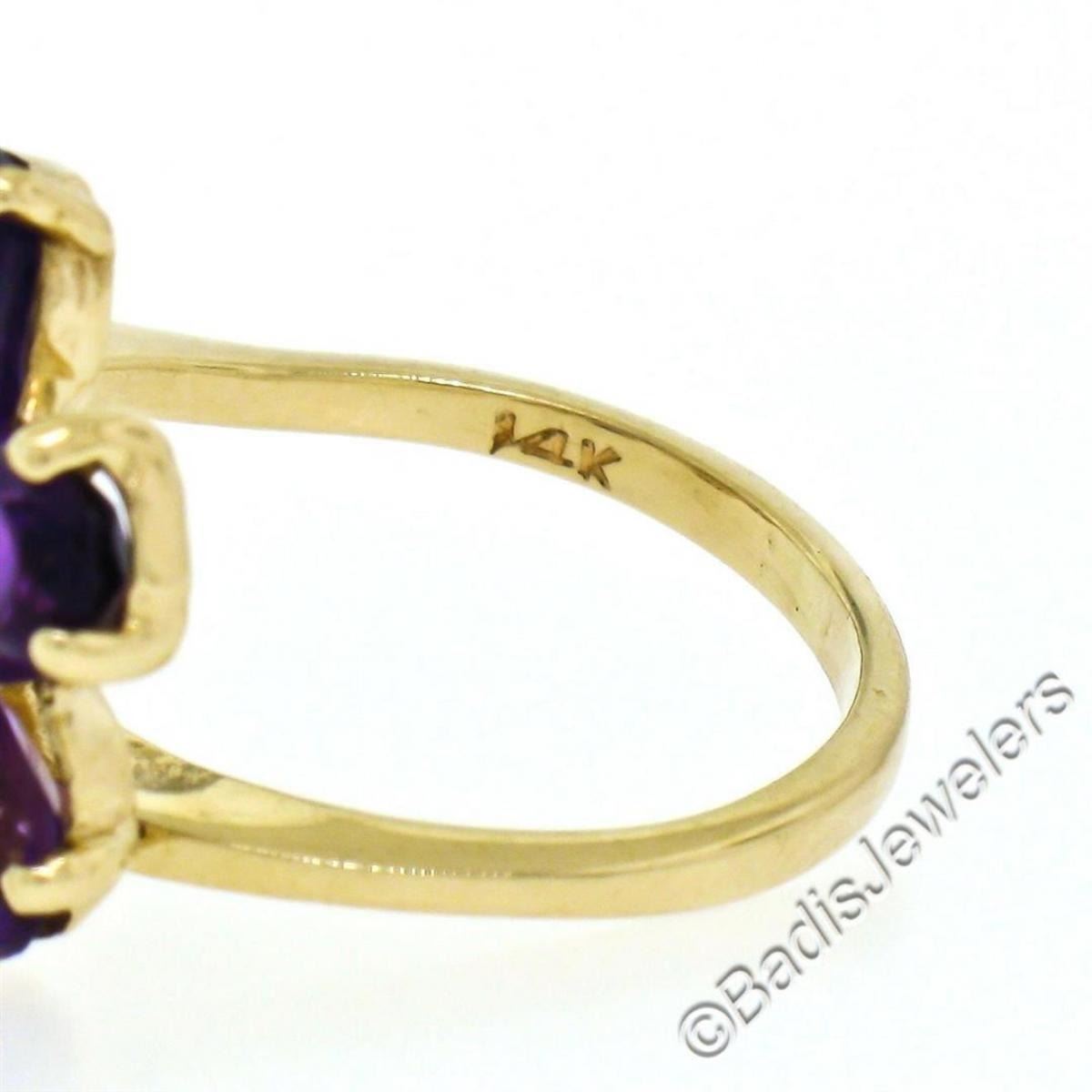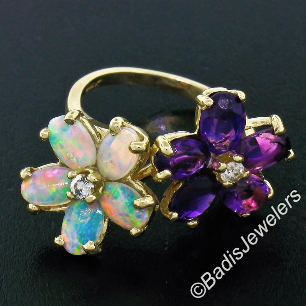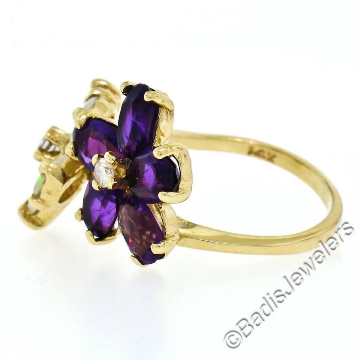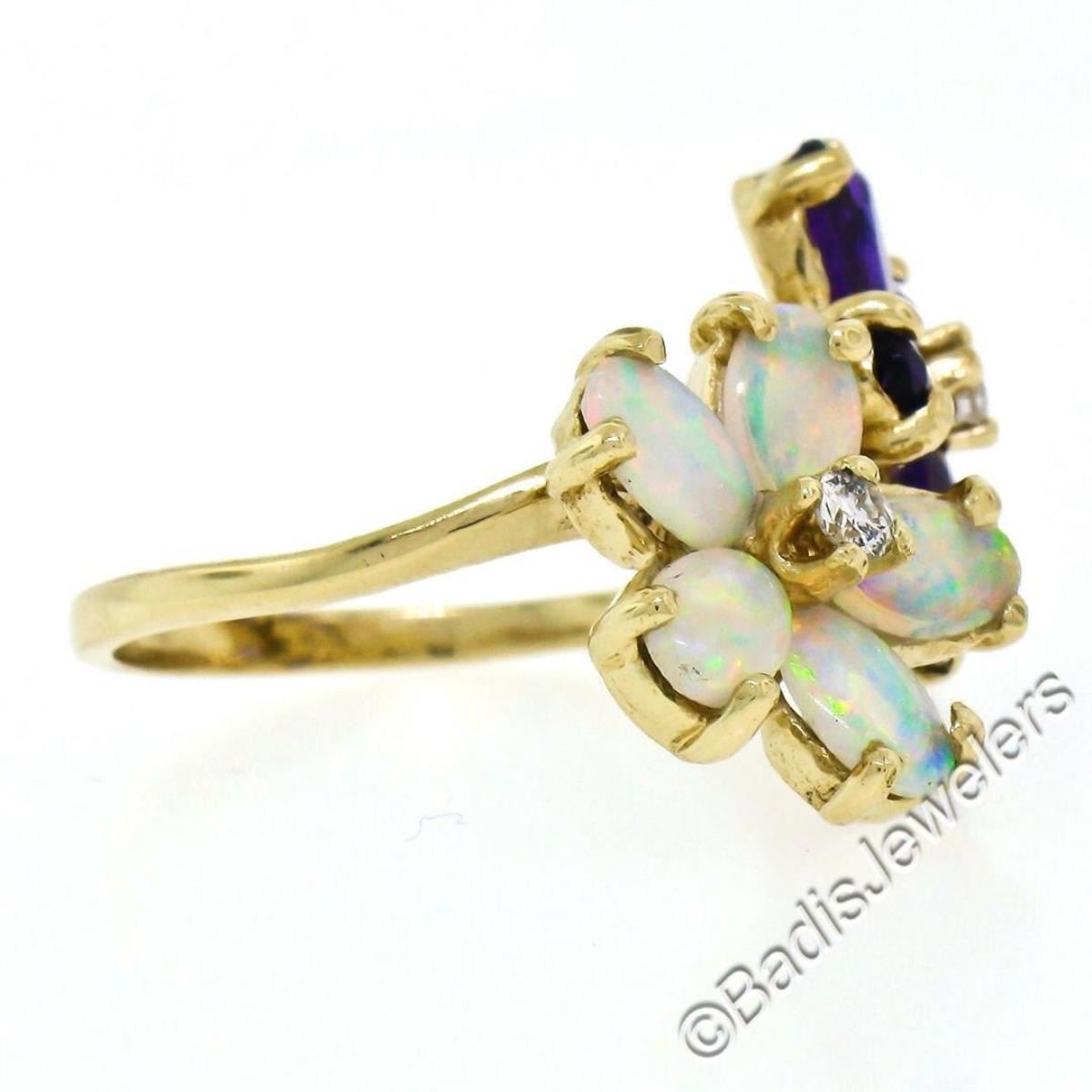 A like new 14kt yellow gold ring with dual flower clusters of oval amethysts (1.50ctw) and oval cabochon opals (1.10ctw) accented by 0.10ctw of round diamonds (G/H - VS2). The ring is size 5.5, weighs a total of 4.8 grams, and the top measures approximately 13.65mm wide.