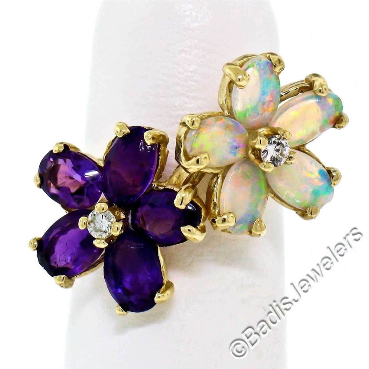 A like new 14kt yellow gold ring with dual flower clusters of oval amethysts (1.50ctw) and oval cabochon opals (1.10ctw) accented by 0.10ctw of round diamonds (G/H - VS2). The ring is size 5.5, weighs a total of 4.8 grams, and the top measures approximately 13.65mm wide.