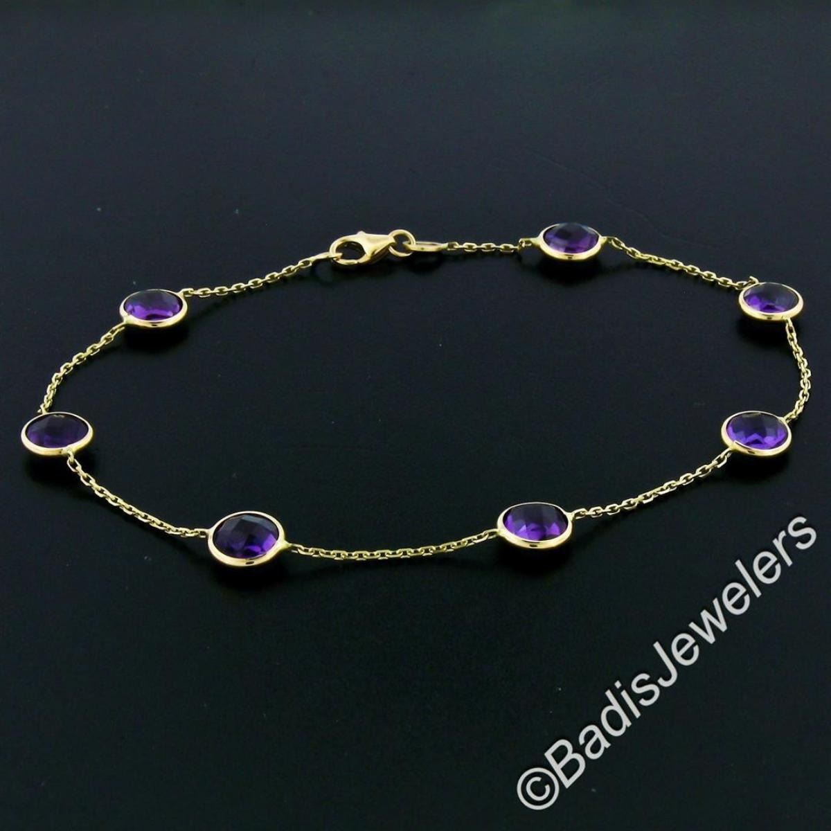A like new 14kt yellow gold bracelet with 5.25ctw of round checkerboard cut amethysts. It weighs a total of 2.32 grams, measures 6.70mm wide, and measures 7.5 inches in length.