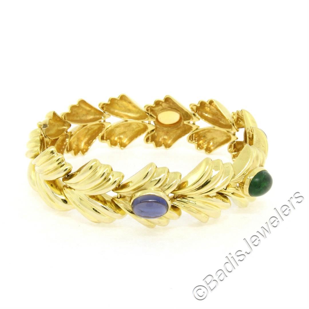 An excellent condition 14kt yellow gold leaf bracelet bezel set with an oval cabochon cut green tourmaline (1.97ct), pink tourmaline (1.73ct), amethyst (1.51ct), and citrine (1.60ct). It weighs a total of 44.6 grams, measures 18.5mm wide, and measures 7 inches in length.