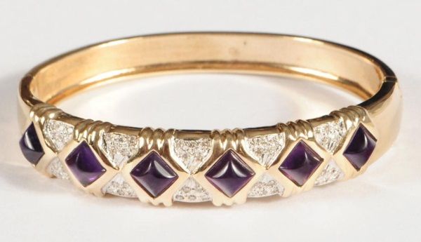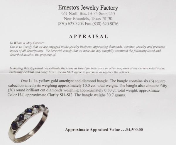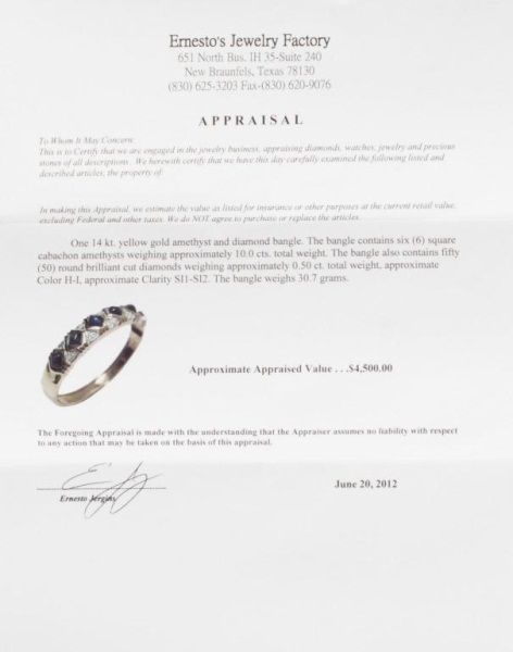 With appraisal: "One 14kt. yellow gold amethyst and diamond bangle. The bangle contains six (6) square cabachon amethyst weighing approx. 10.0 cts. total weight. The bangle also contains fifty (50) round brilliant cut diamonds weighing approx. 0.50 ct. total weight, approx. Color H-I, approx. Clarity SI1-SI2. the bangle weighs 30.7 grams. Approx. appraised value: $4,500."