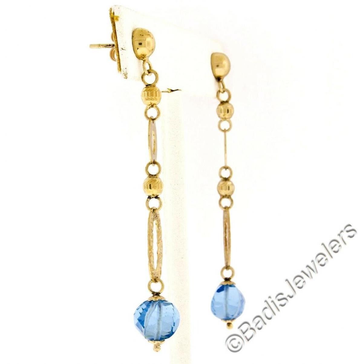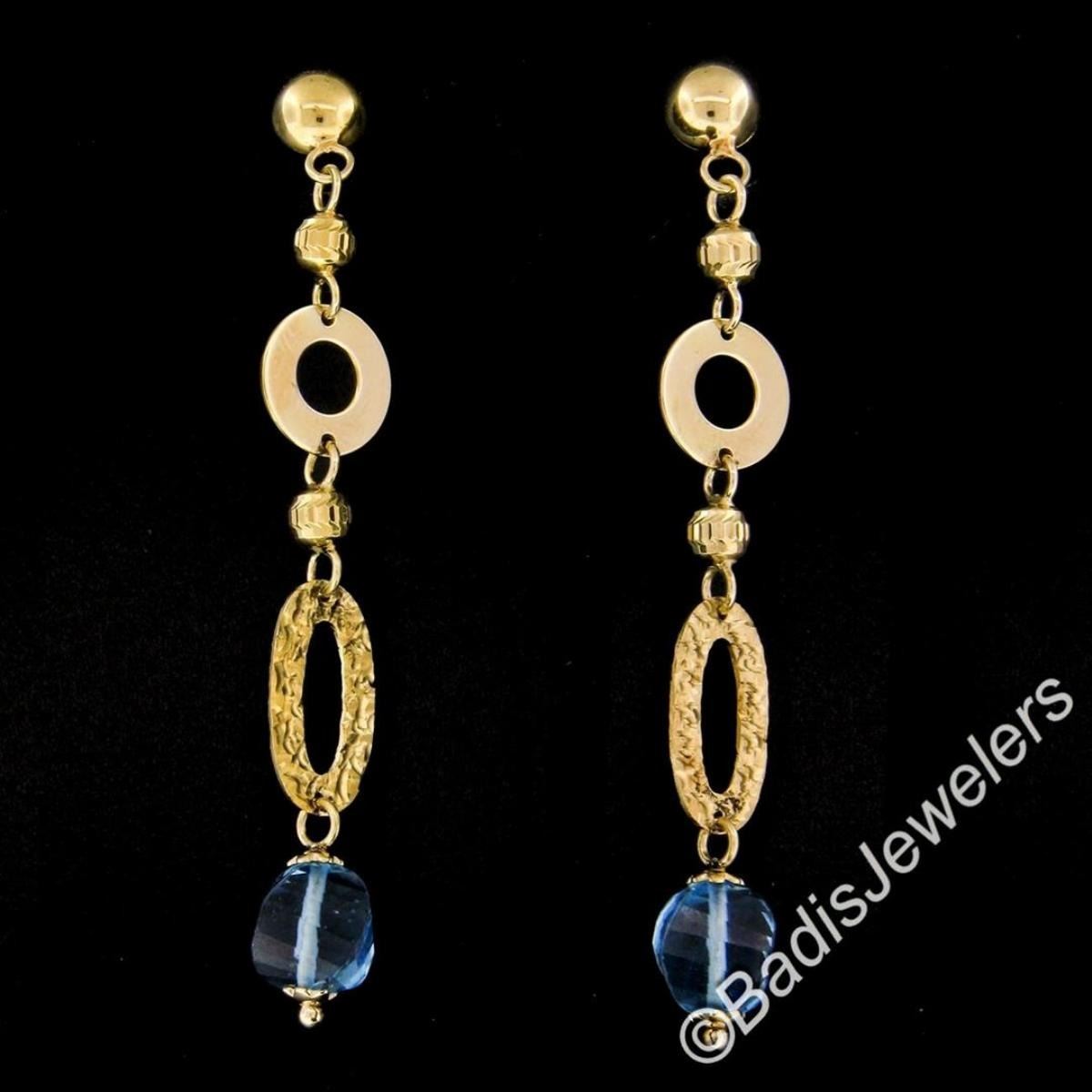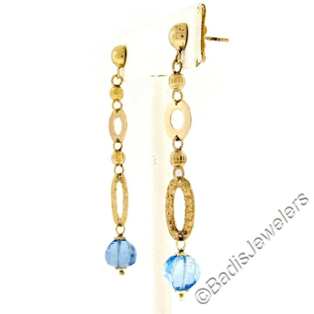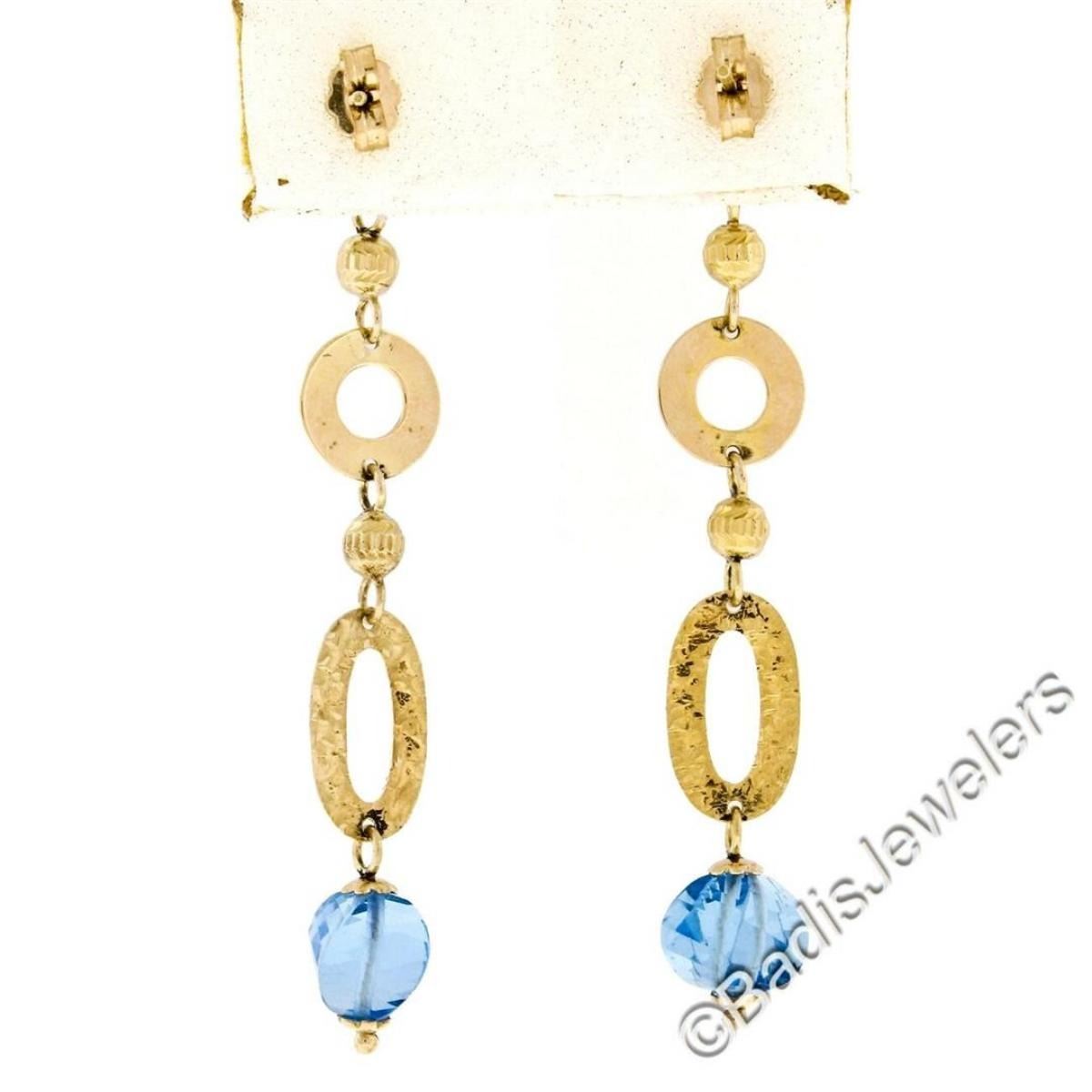 14kt Yellow Gold Briolette Cut Blue Topaz Bead Long Textured Dangle Earrings