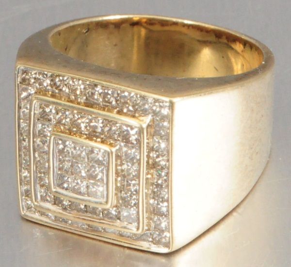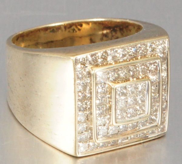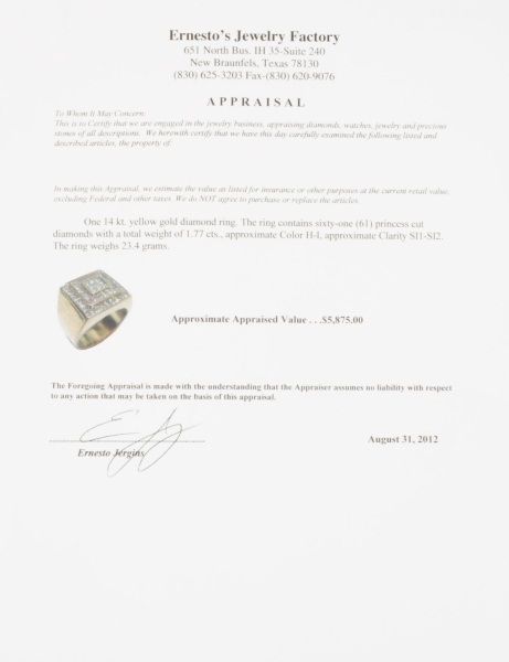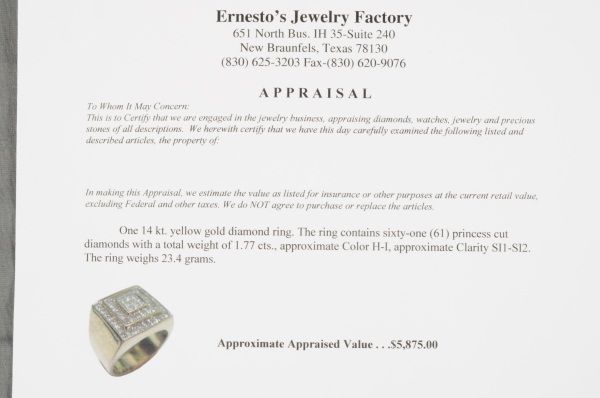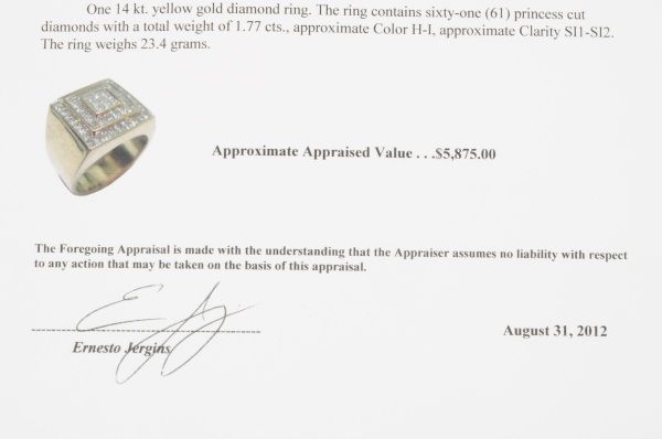 With appraisal: "One 14kt. yellow gold diamond ring. The ring contains sixty-one (61) princess cut diamonds with a total weight of 1.77 cts., approx.Color H-I, approx. Clarity SI1-SI2. The ring weighs 23.4grams. Approx. Appraised Value: $5,875.00."