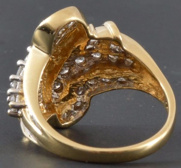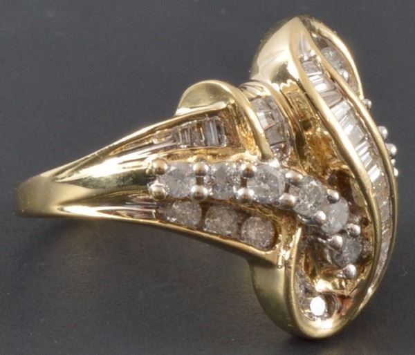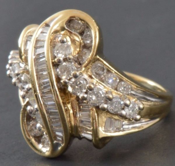 With appraisal: "One 14kt yellow gold and diamond ring. The ring contains twenty -four (24) round brilliant cut diamonds and thirty-three (33) straight and tapered baguette diamonds with an approximate total weight of 1.00 ct. The diamonds have an approximate color of H-J and an approximate clarity of I1. The ring weighs 6.5 grams. Approximate appraised value $2,450.00."