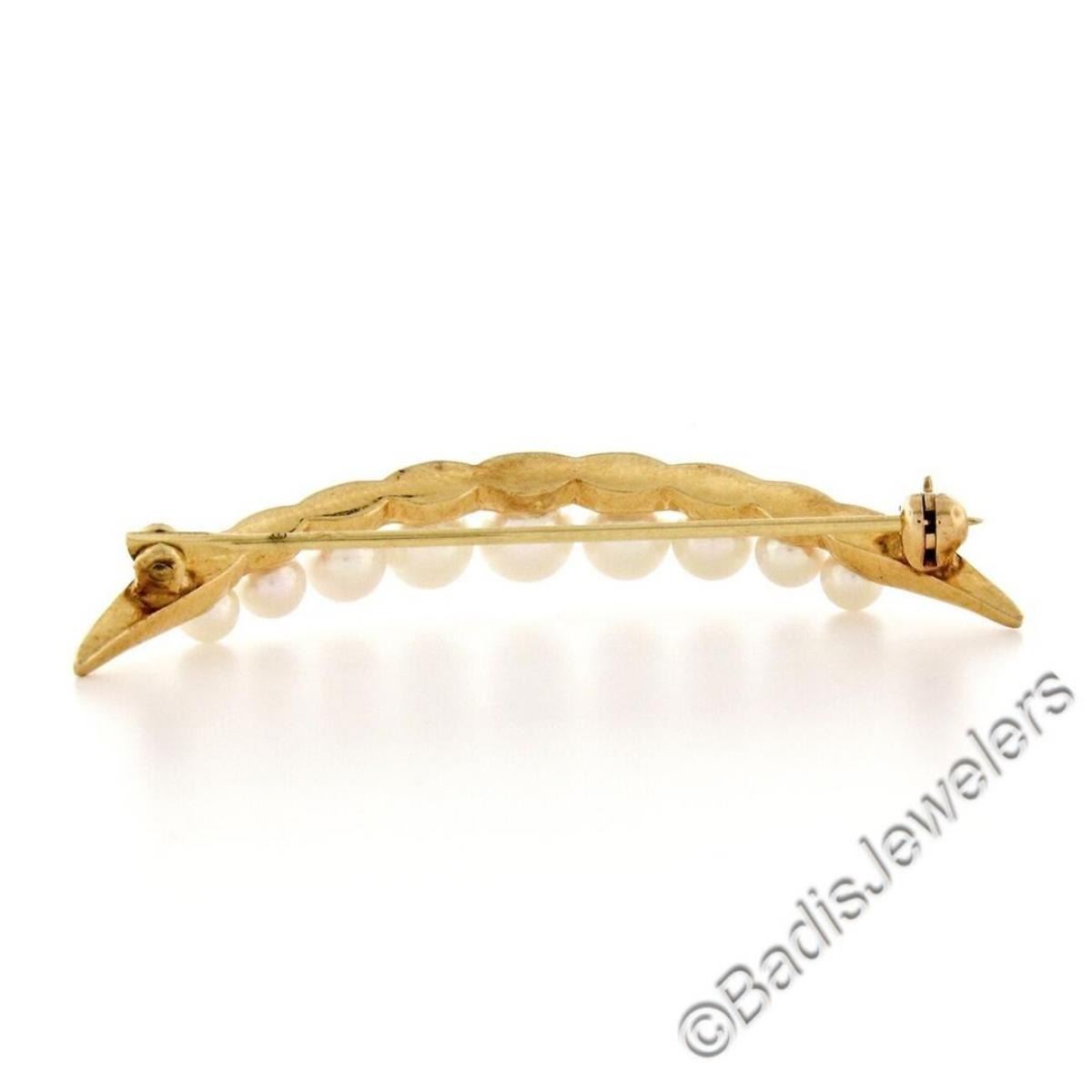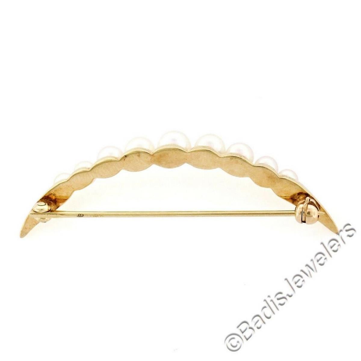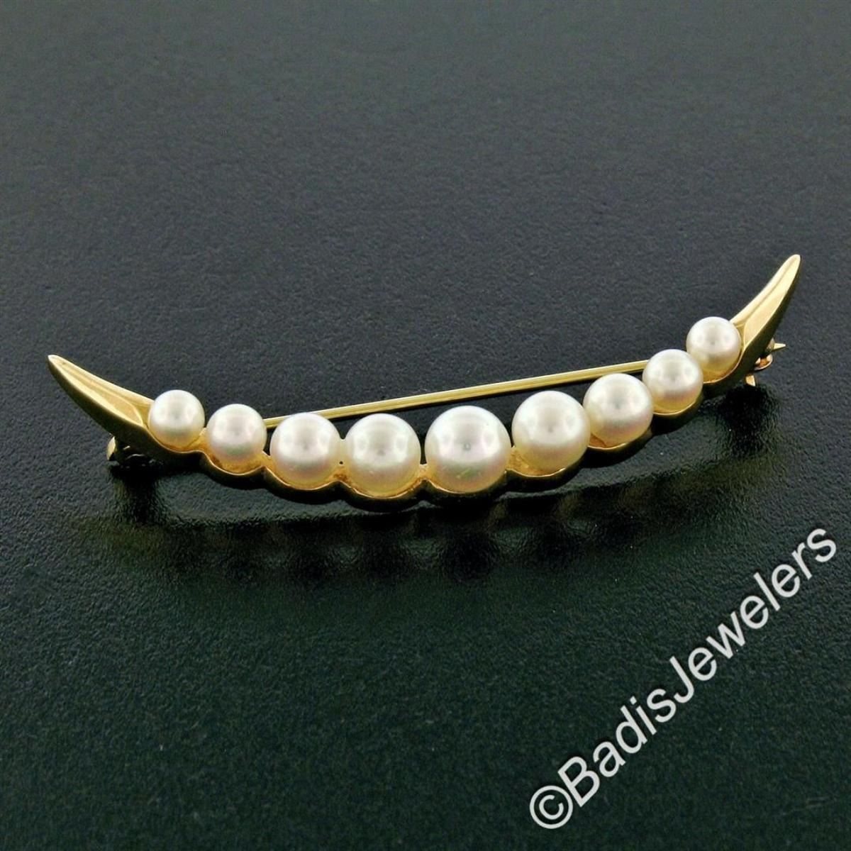 A 14kt yellow gold graduated (4.90 to 3.15mm) round cultured pearl crescent pin brooch. Measures 44.5mm wide and weighs a total of 4.17 grams.