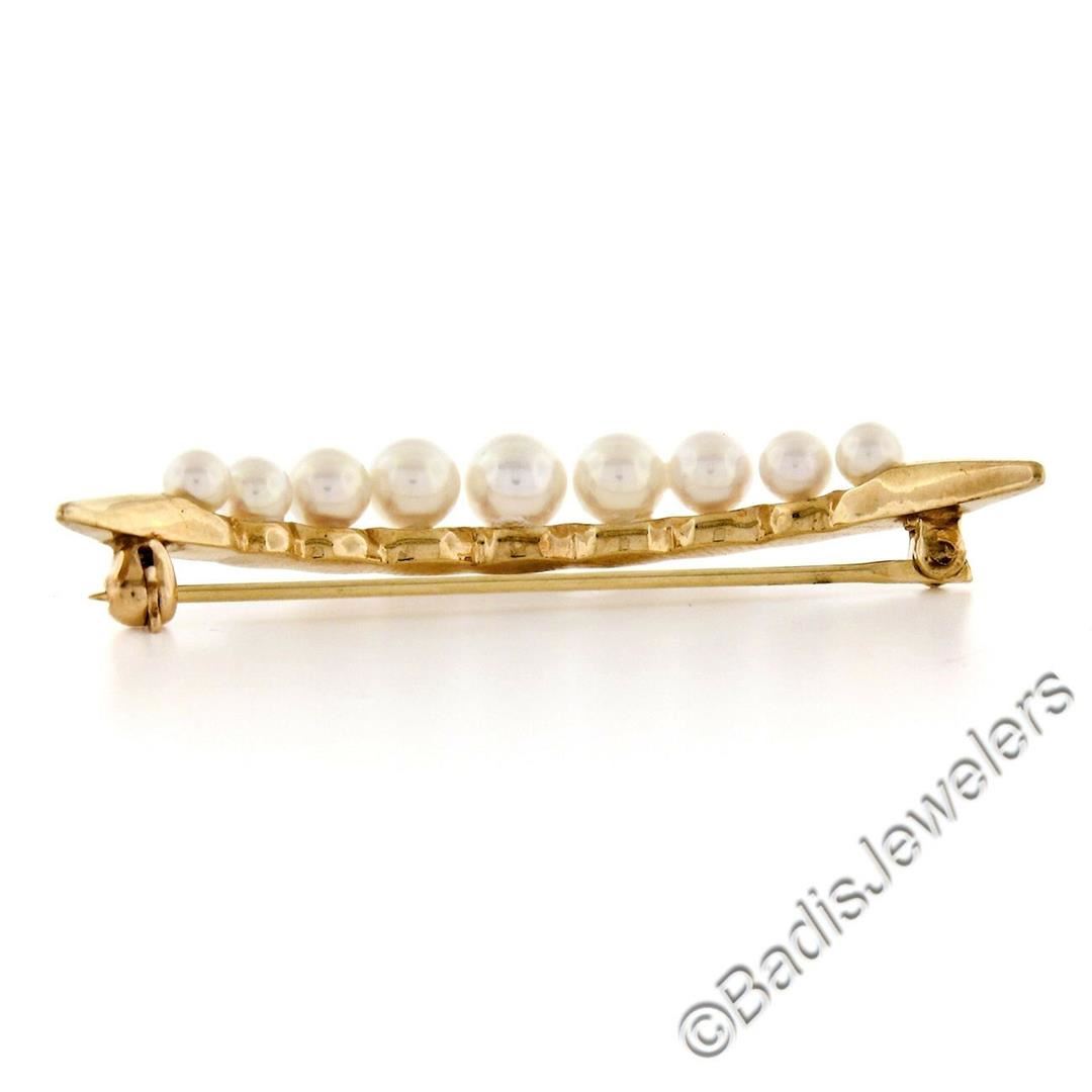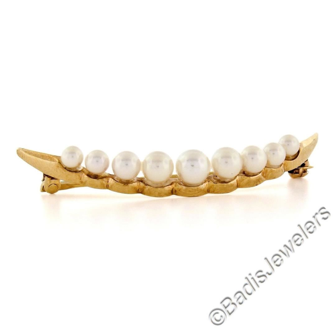 A 14kt yellow gold graduated (4.90 to 3.15mm) round cultured pearl crescent pin brooch. Measures 44.5mm wide and weighs a total of 4.17 grams.