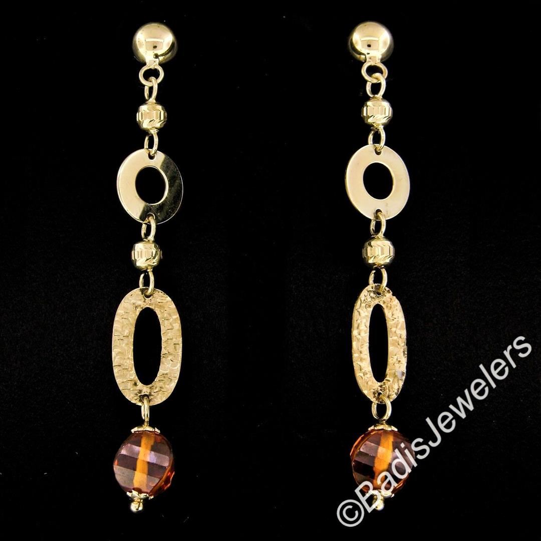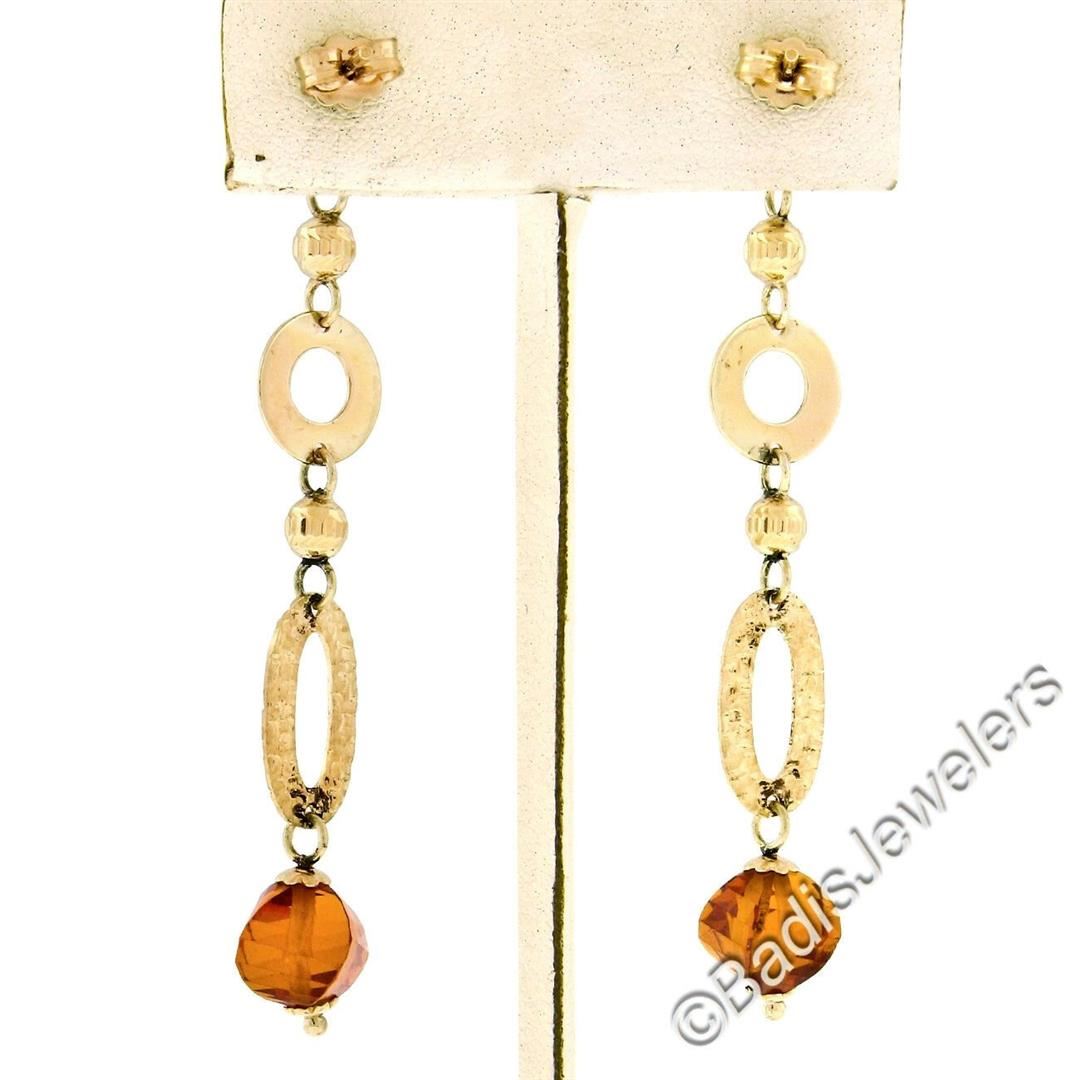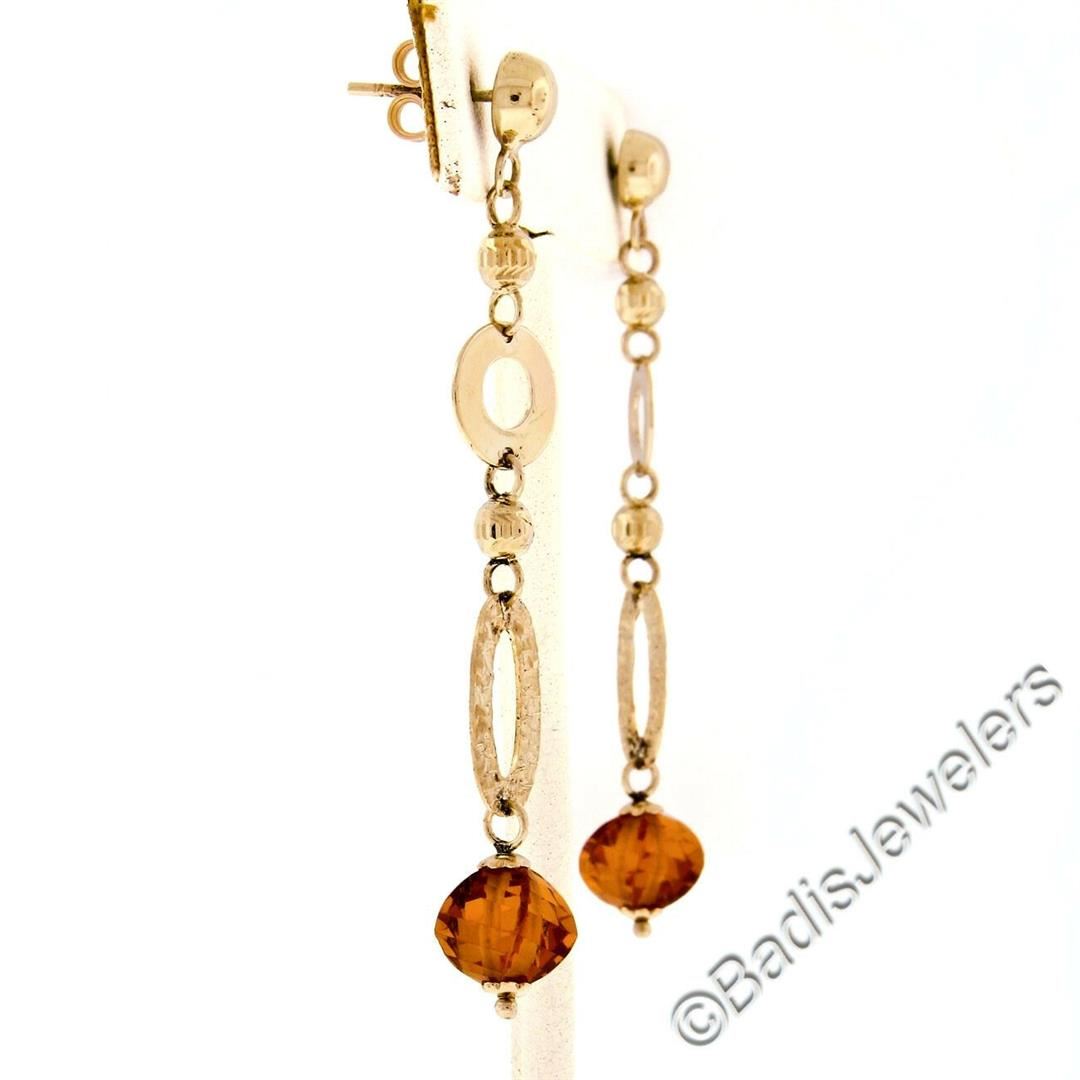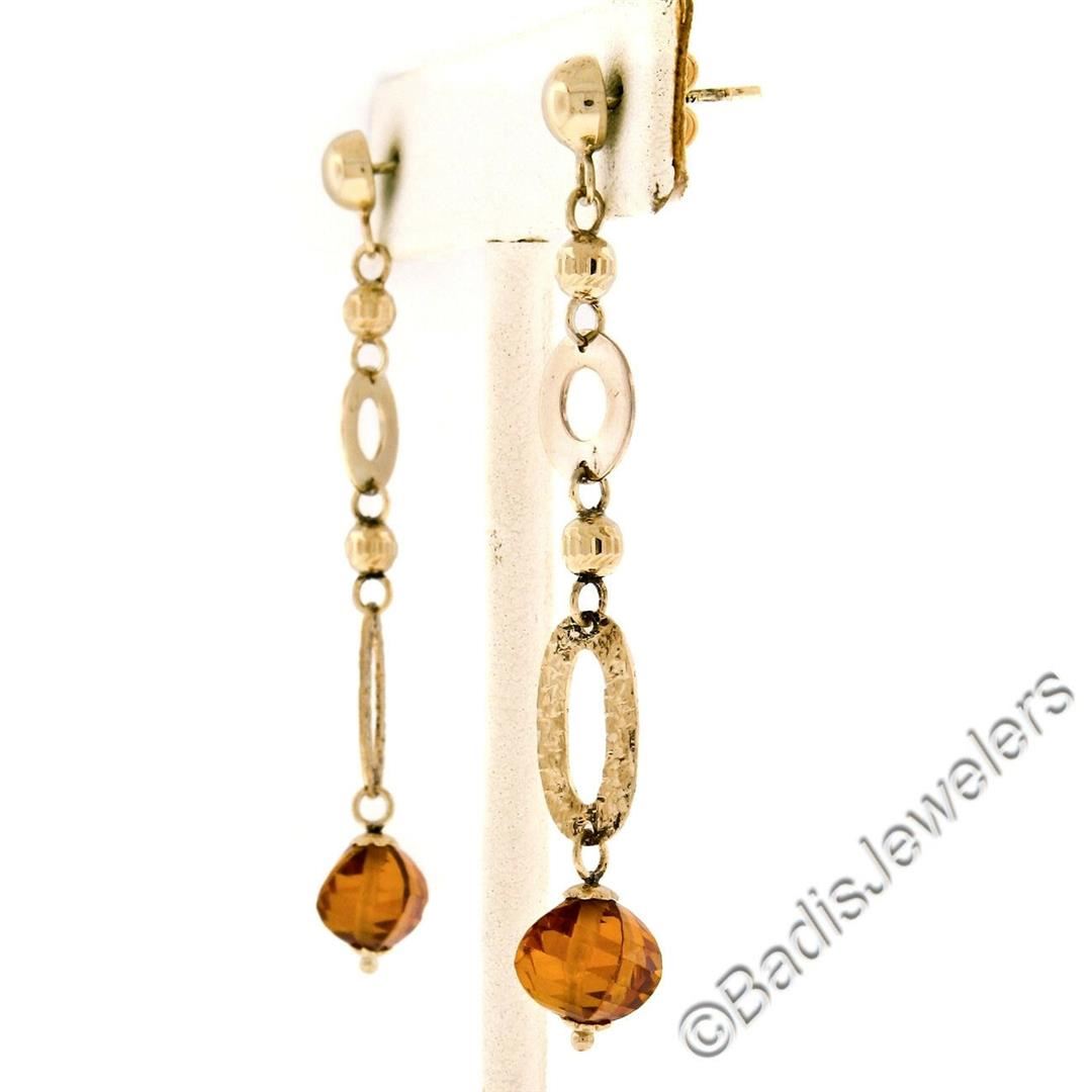 A pair of long 14kt yellow gold dangle earrings with 7.1x9.1mm briolette cut citrine beads. The earrings measure approximately 61.45x9.50mm and weigh a total of 5.85 grams.