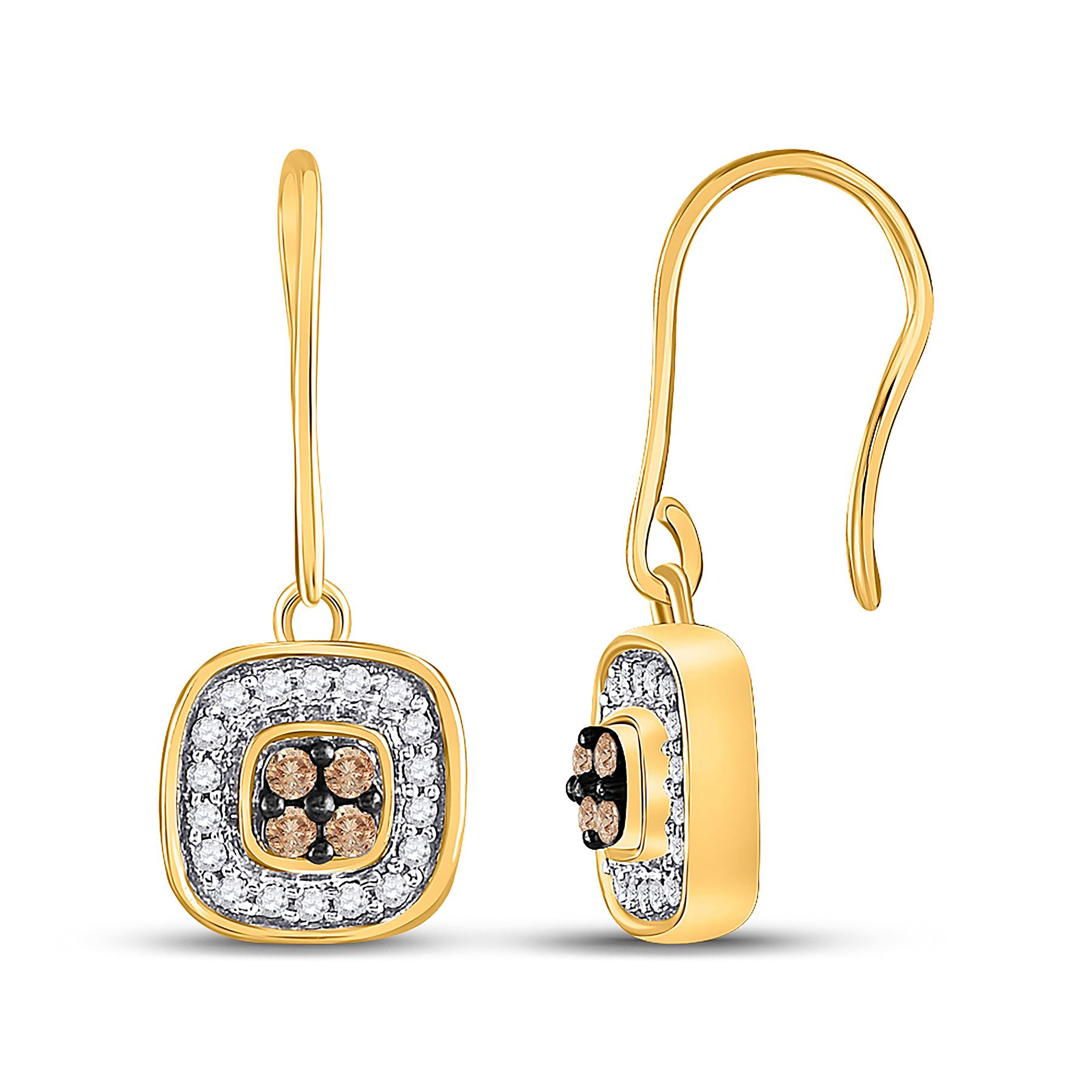 14kt Yellow Gold Womens Round Brown Diamond Square Cluster Dangle Earrings 1/3 Cttw