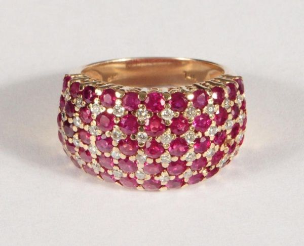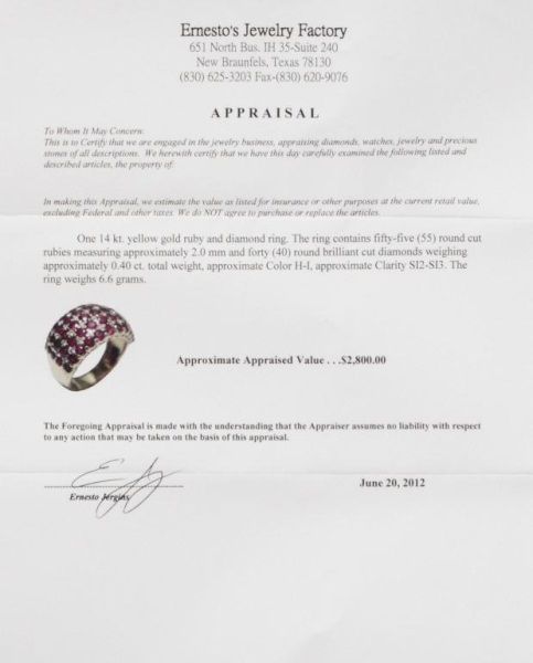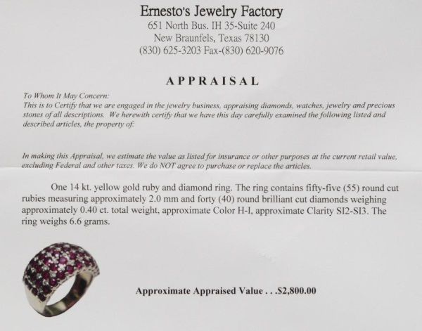 With appraisal: "One 14kt yellow gold ruby and diamond ring. The ring contains fifty-five (55) round cut rubies measuring approx. 2.0 mm and forty (40) round brilliant cut diamonds weighing approx. 0.40 ct total weight, approx. Color H-I, approx. Clarity SI2-SI3. The ring weighs 6.6 grams. Approx. appraised value: $2,800."