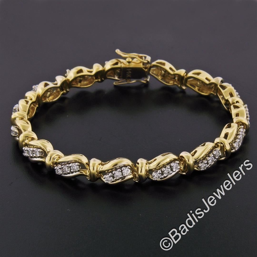 A like new 14kt gold tennis bracelet with wavy yellow gold links and 1.80ctw of round diamonds (F/G - VS2) set in white gold prongs. It weighs a total of 19.74 grams, measures 6.85mm wide, and measures 7 inches in length.