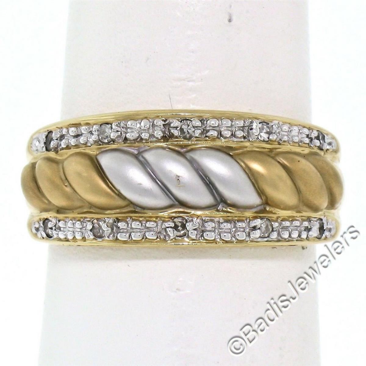 An excellent condition 14kt yellow and white gold band ring with 0.05ctw of round single cut diamonds (I - SI2). The ring is size 7, weighs a total of 4.89 grams, and measures approximately 8.60mm wide.